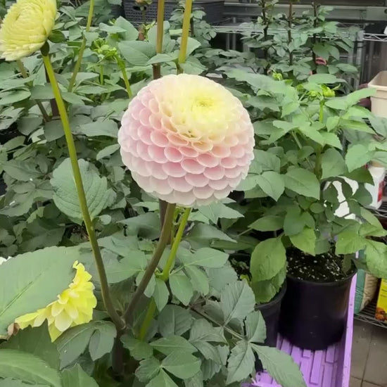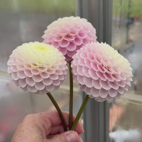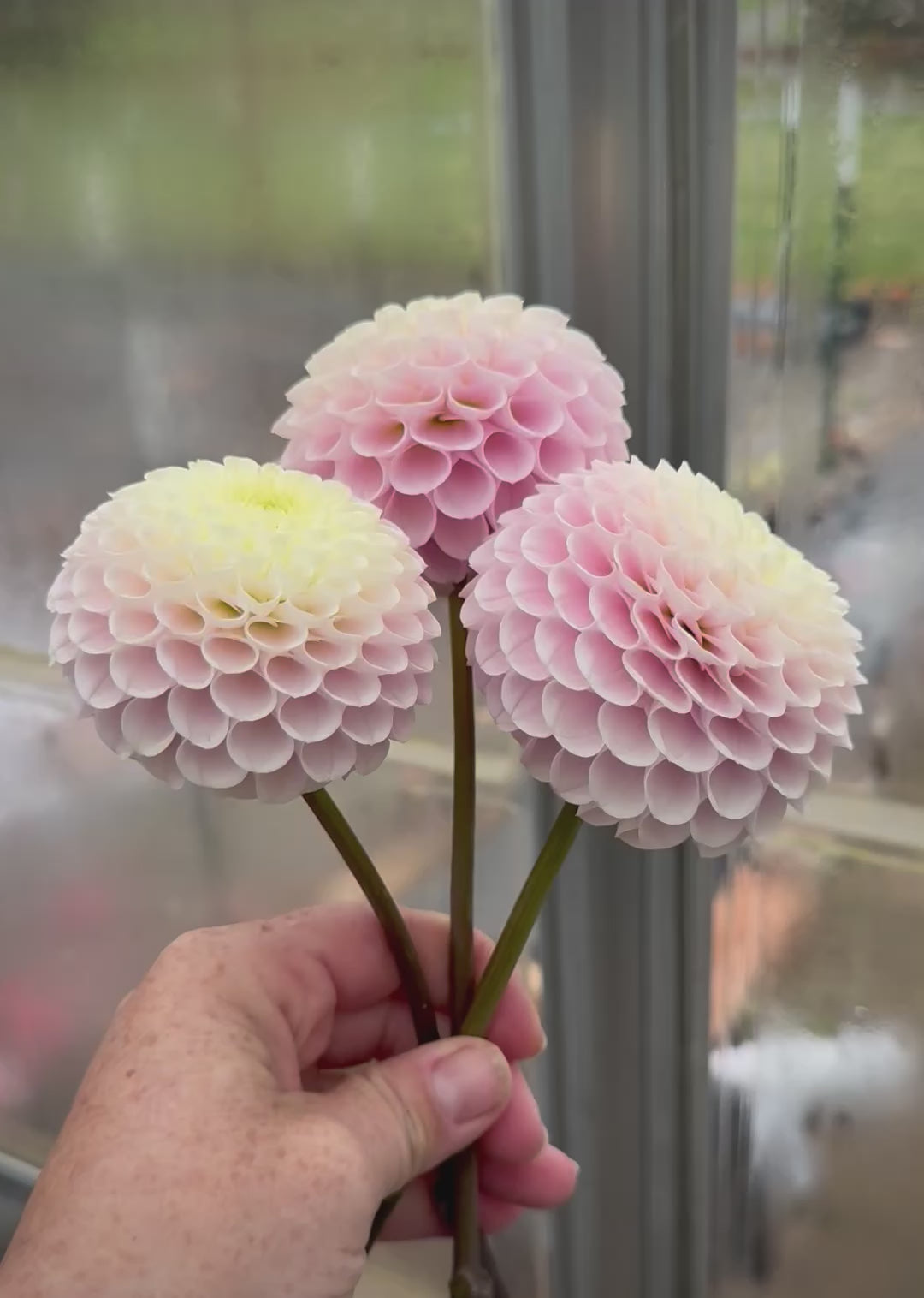 20th Avenue Delicata is absolute perfection. Delicata is an elegant 3 inch ball dahlia that feels straight out of a pastel dream. Perfectly formed blooms open creamy ivory at the center and gently blush outward with shell pink tones, creating a subtle ombré that is simply striking.