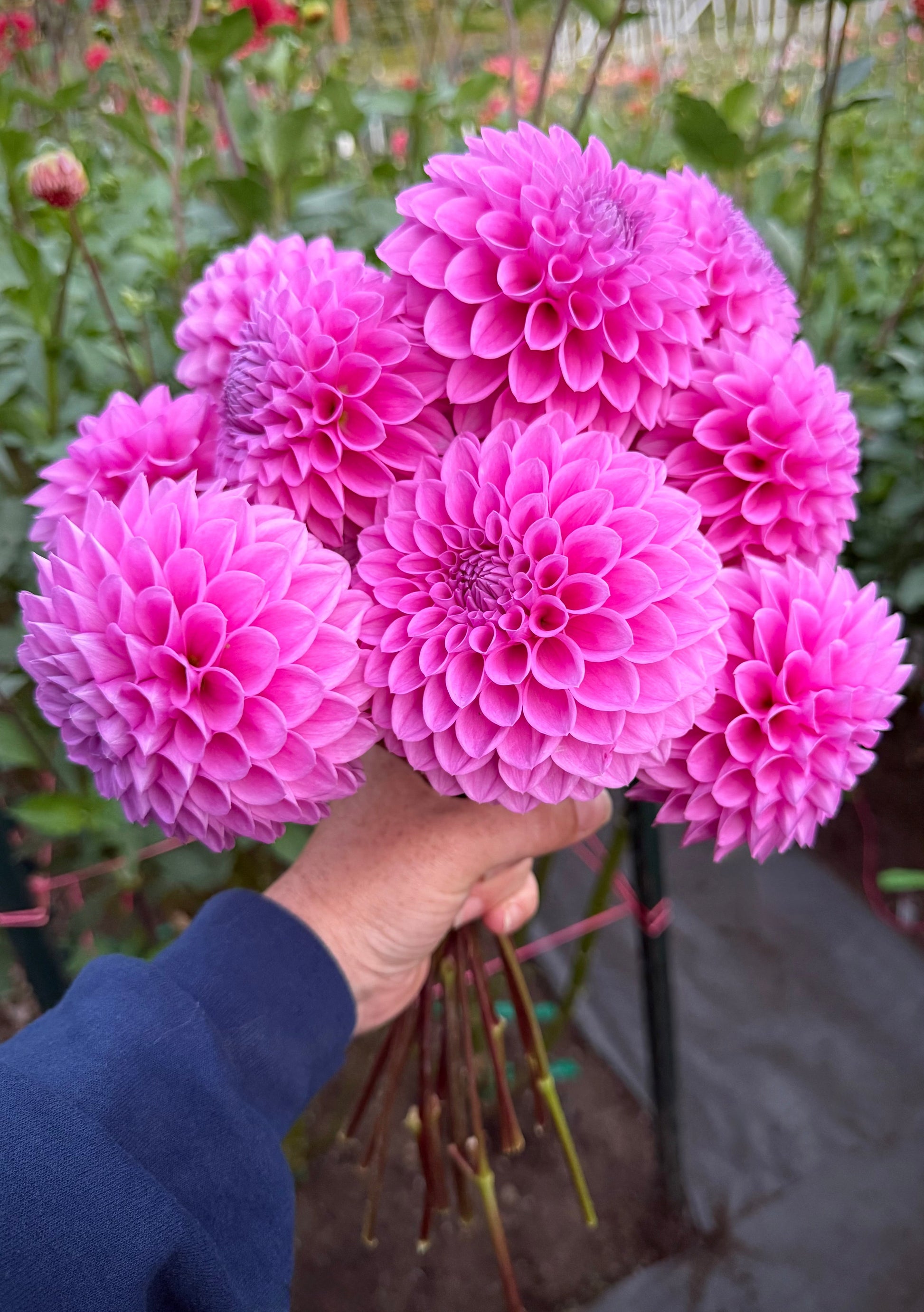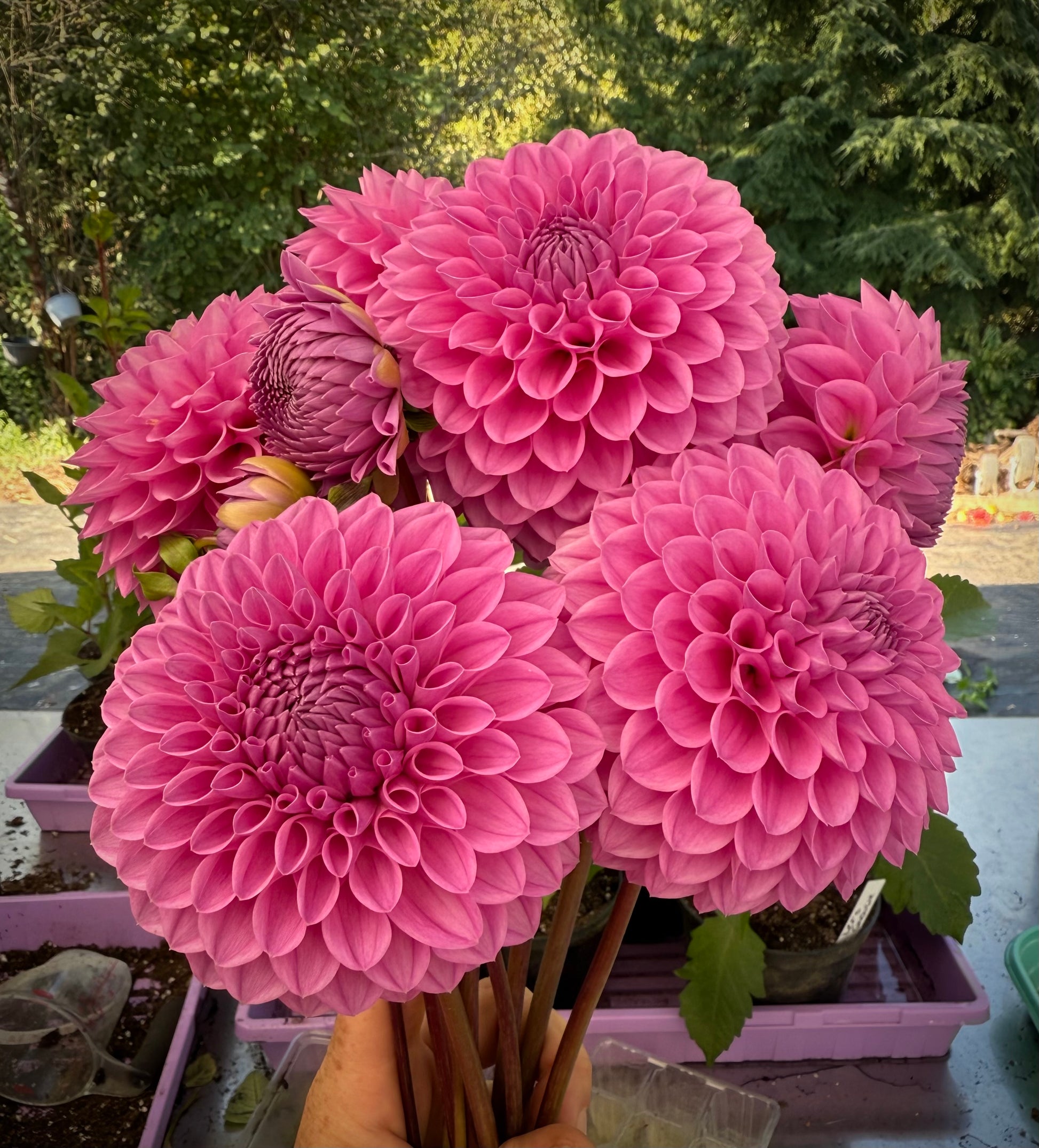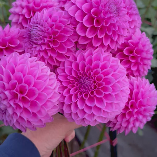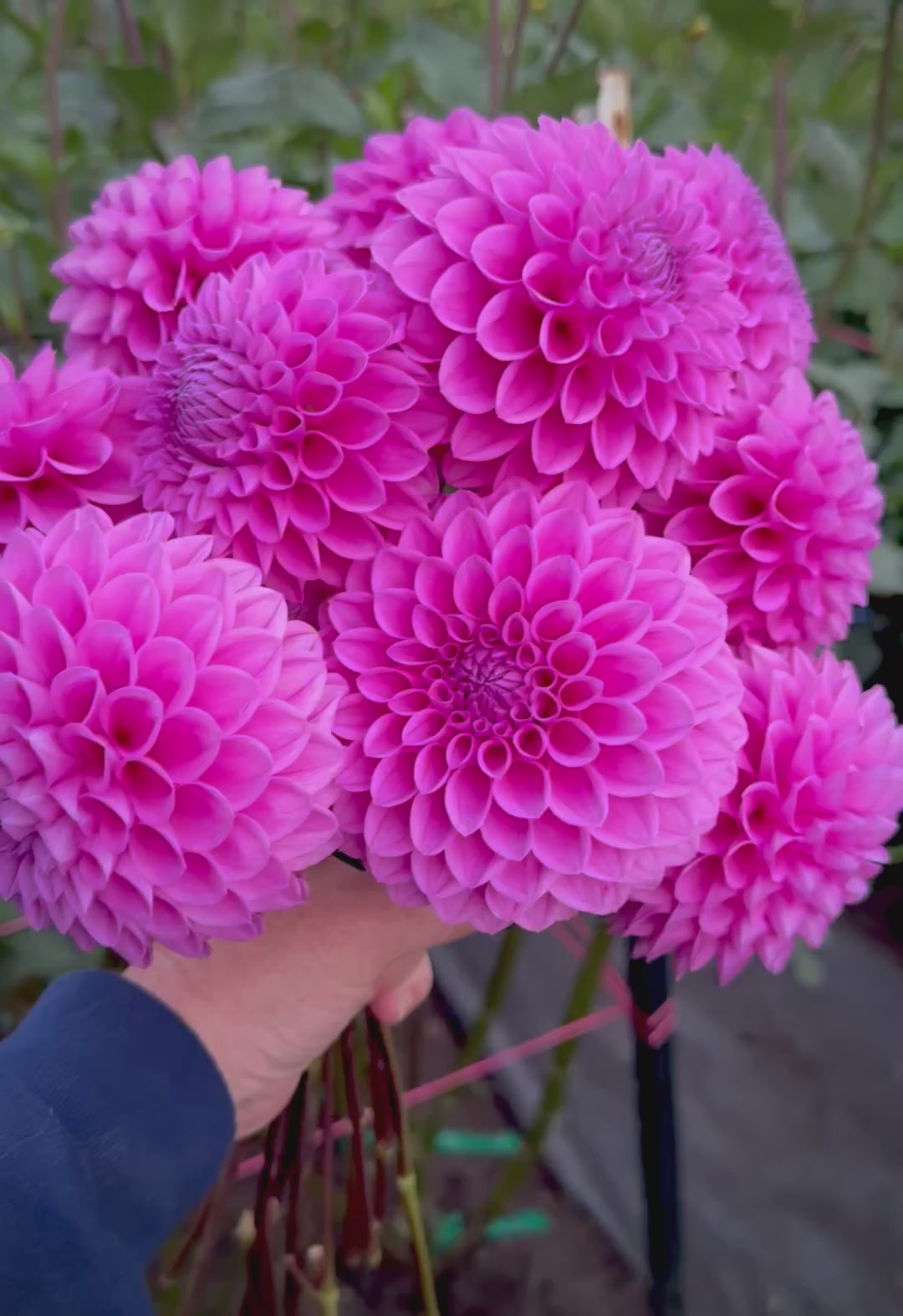 20th Avenue Tranquility is a beautiful 3.5 inch ball dahlia with rich, saturated magenta blooms. Even in the hottest months, they hold their centers beautifully. The flowers are uniform and full, with a high petal count and polished look that works effortlessly in both bouquets and in the landscape. Plants reach about 4 feet tall and produce long, dark, sturdy stems that are ideal for cutting and arranging. Great tuber producer from cuttings and tubers alike. Hybridized by Rich Gibson and released in 2025.