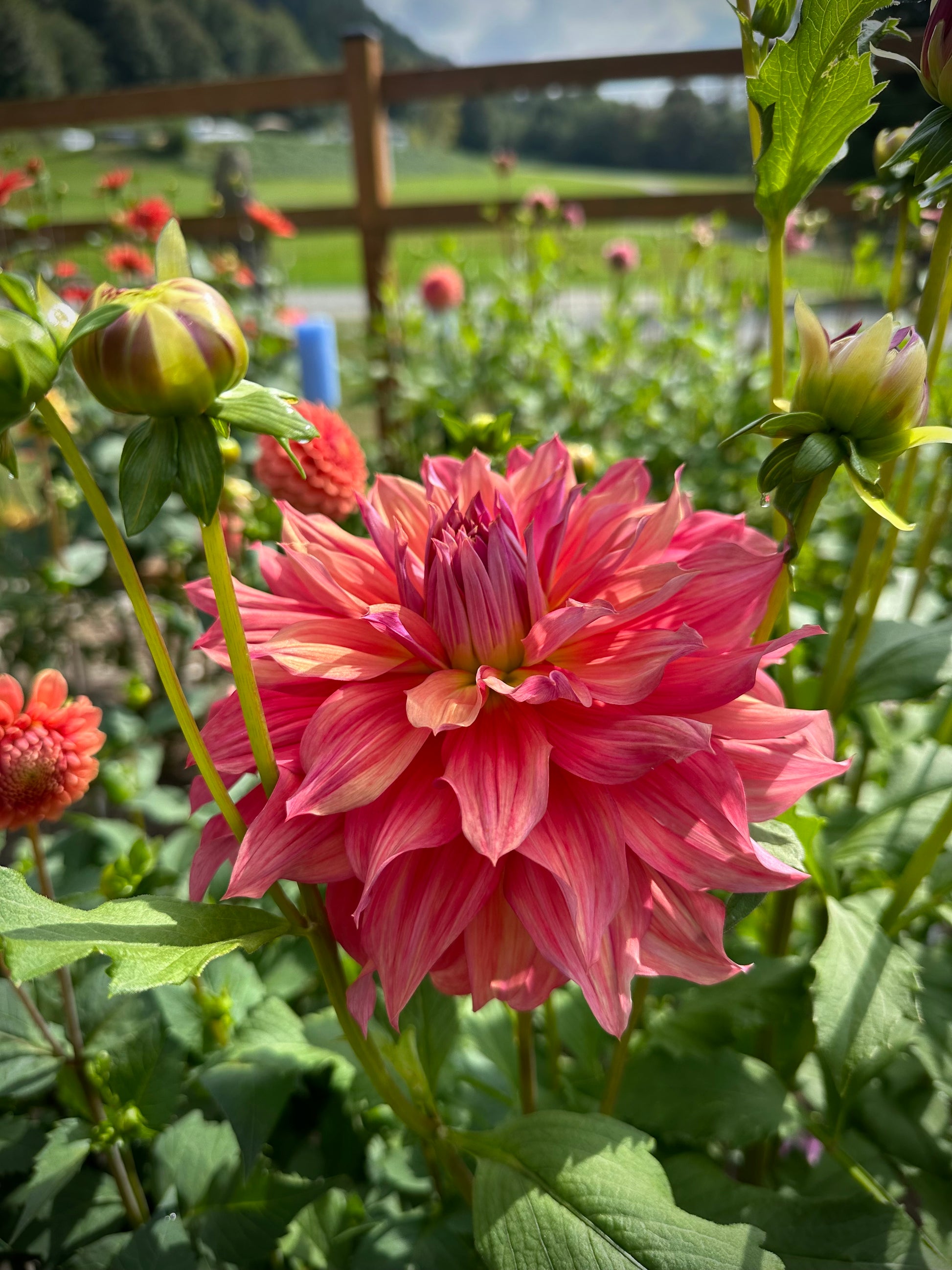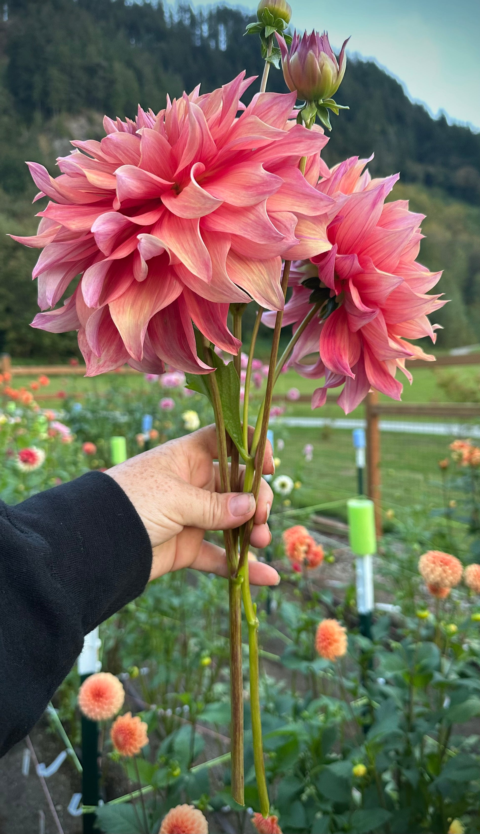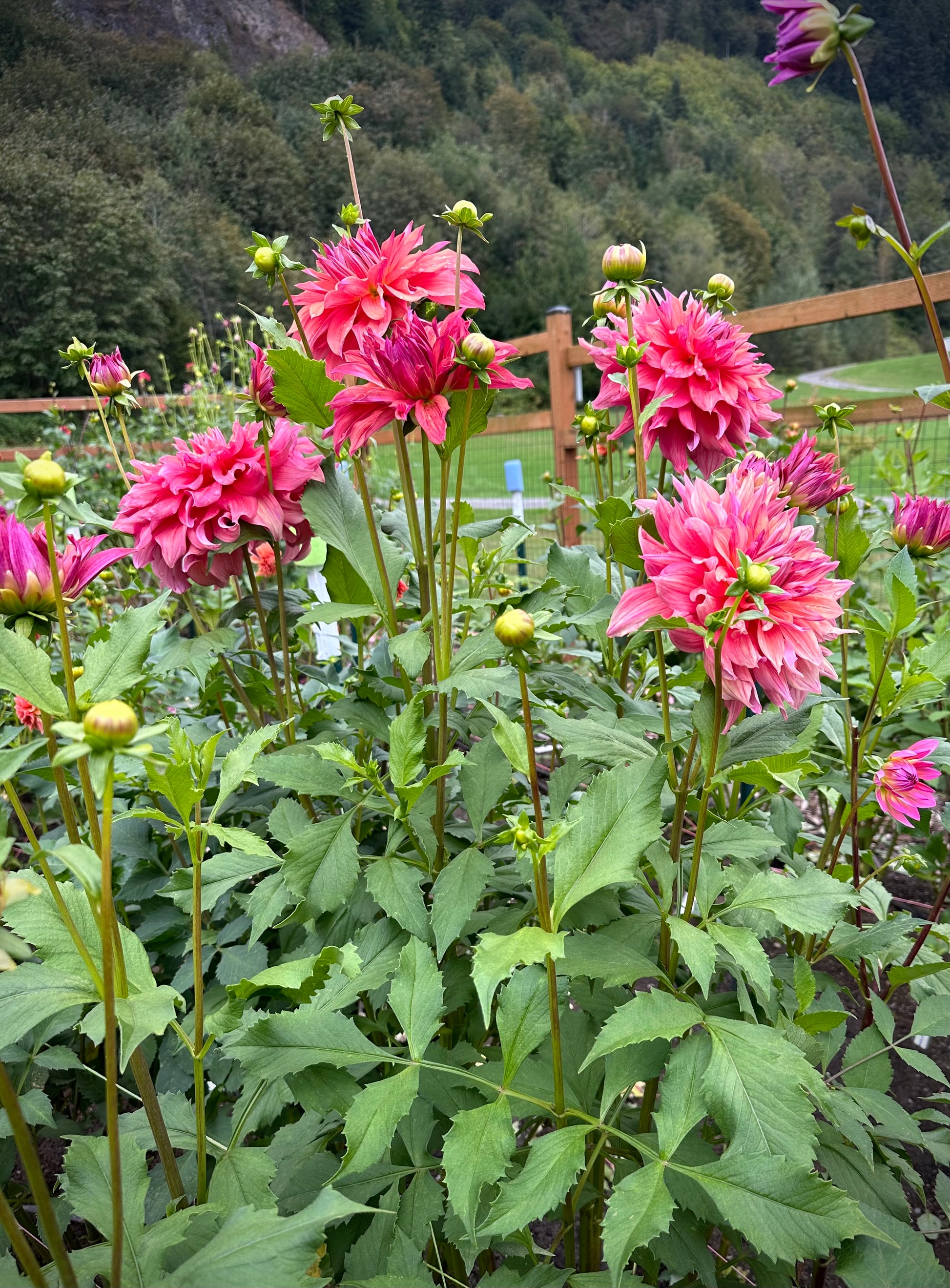 Belle of Barmera has the most beautiful coral pink 10 inch, wispy blooms. They do surprisingly well as cut flowers and always catch your attention. Gorgeous tubers that overwinter well. 4’ plant height.
