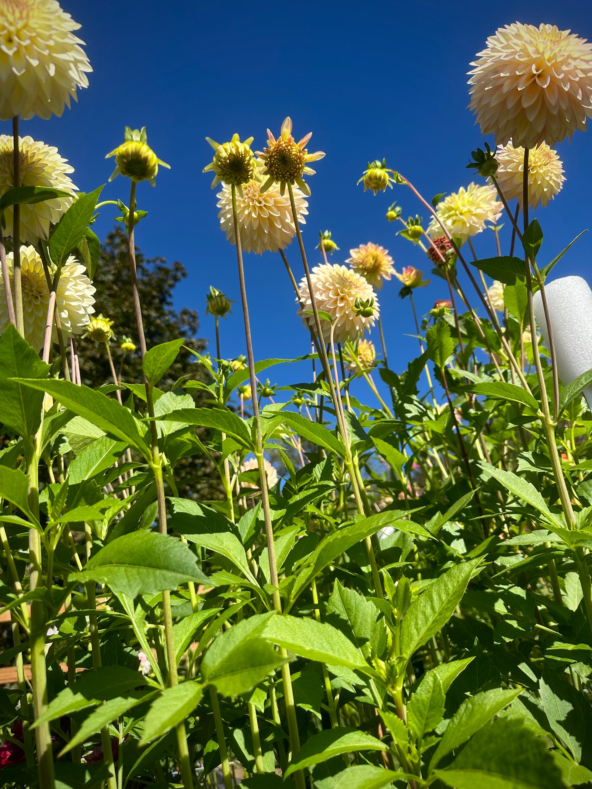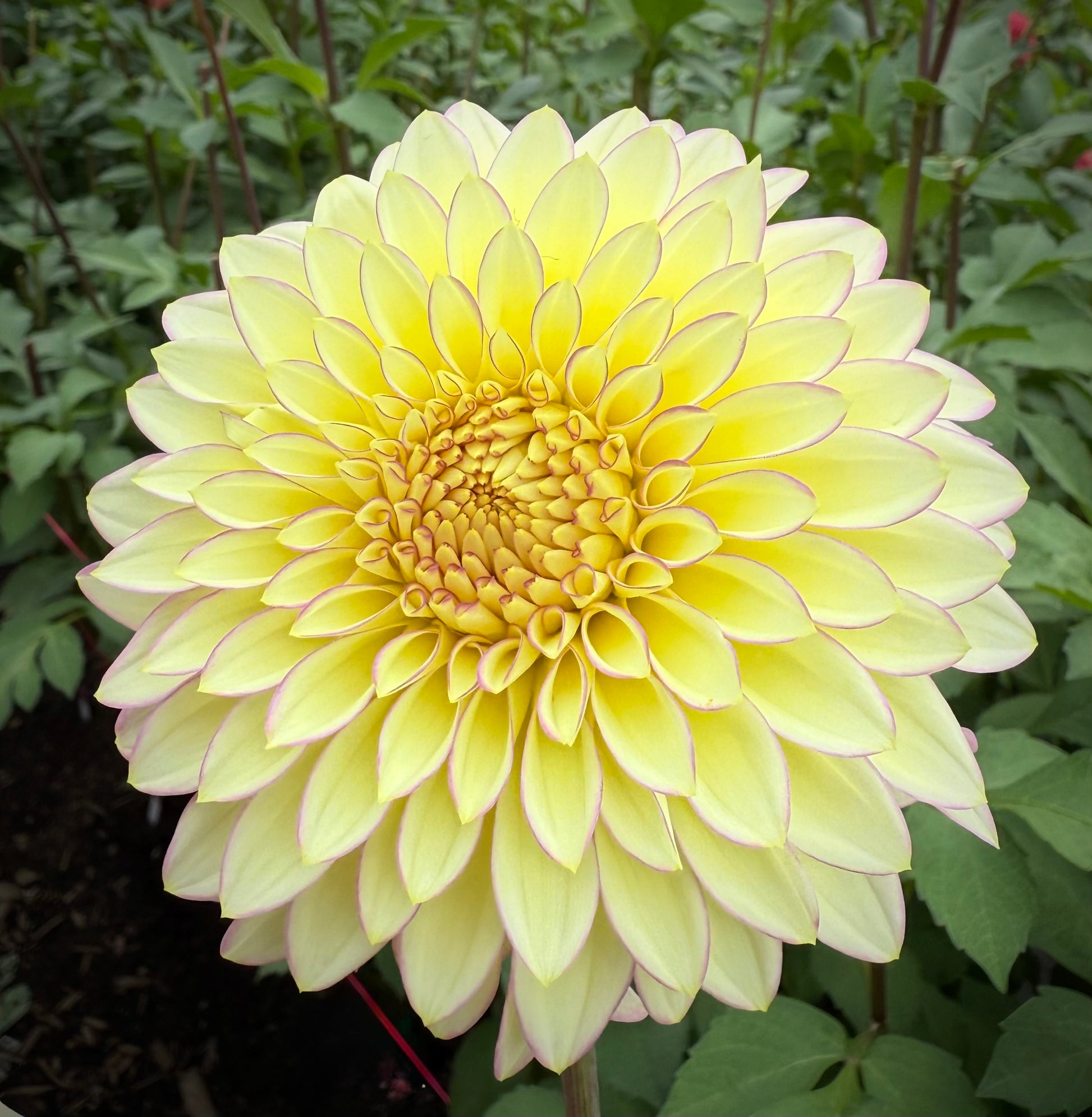 Another stunner by Bloomquist. Exquisite lemon colored petals lined in the most perfect blush pink. 5 inch blooms with high petal count and gorgeous in bouquets. Long stems. Cuttings make great tubers. Plant height 5’. Hybridized by Paul Bloomquist.