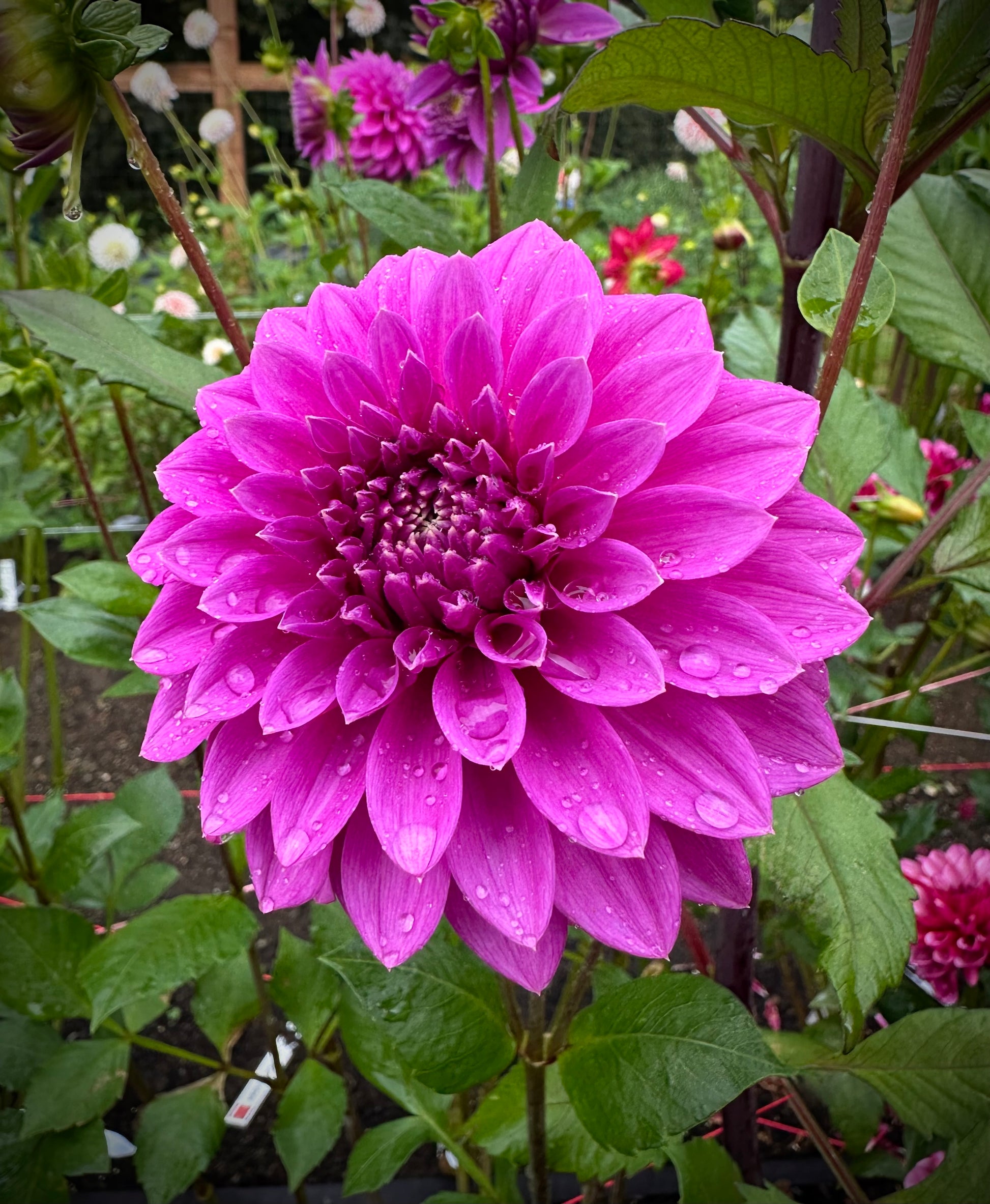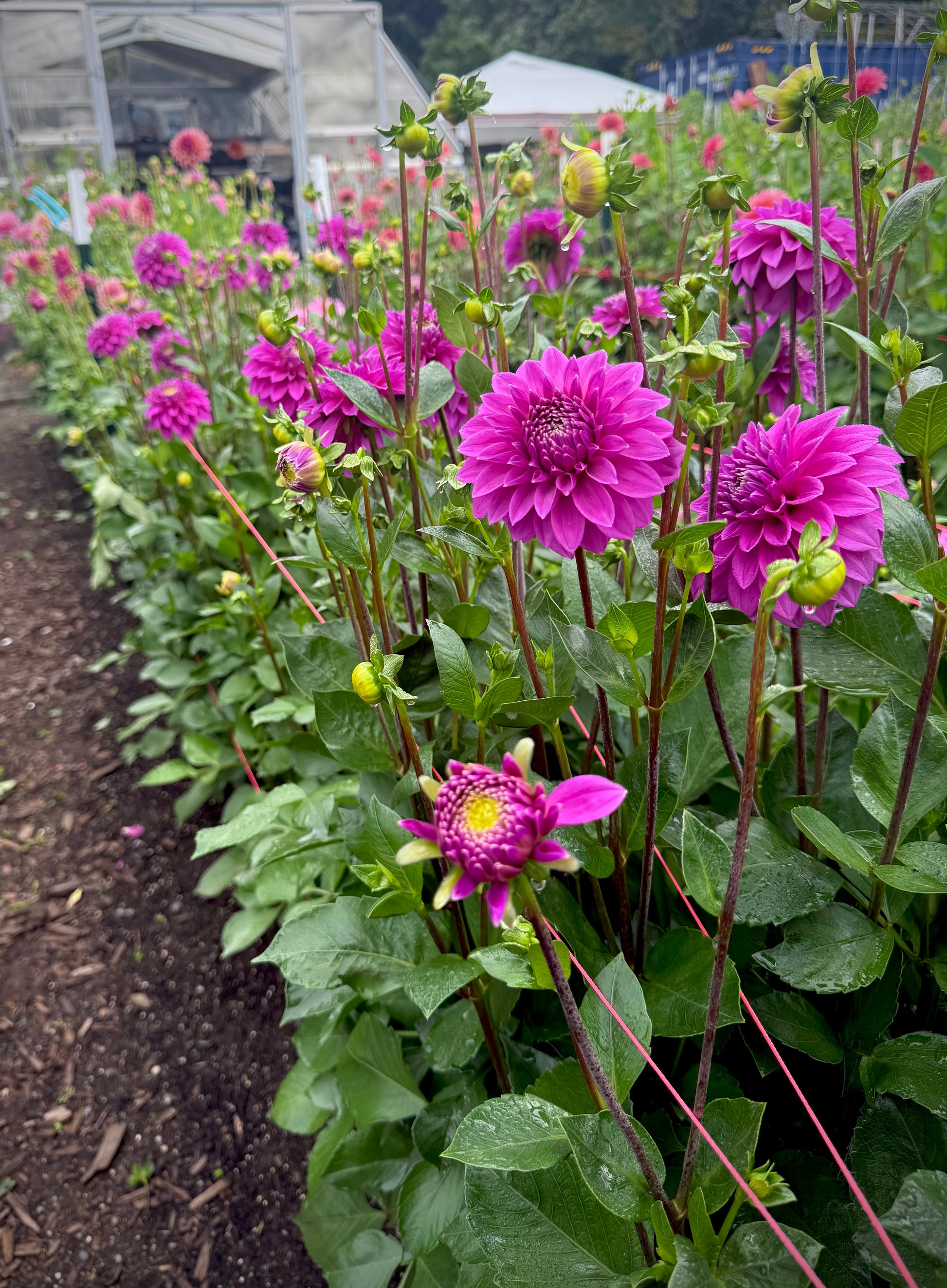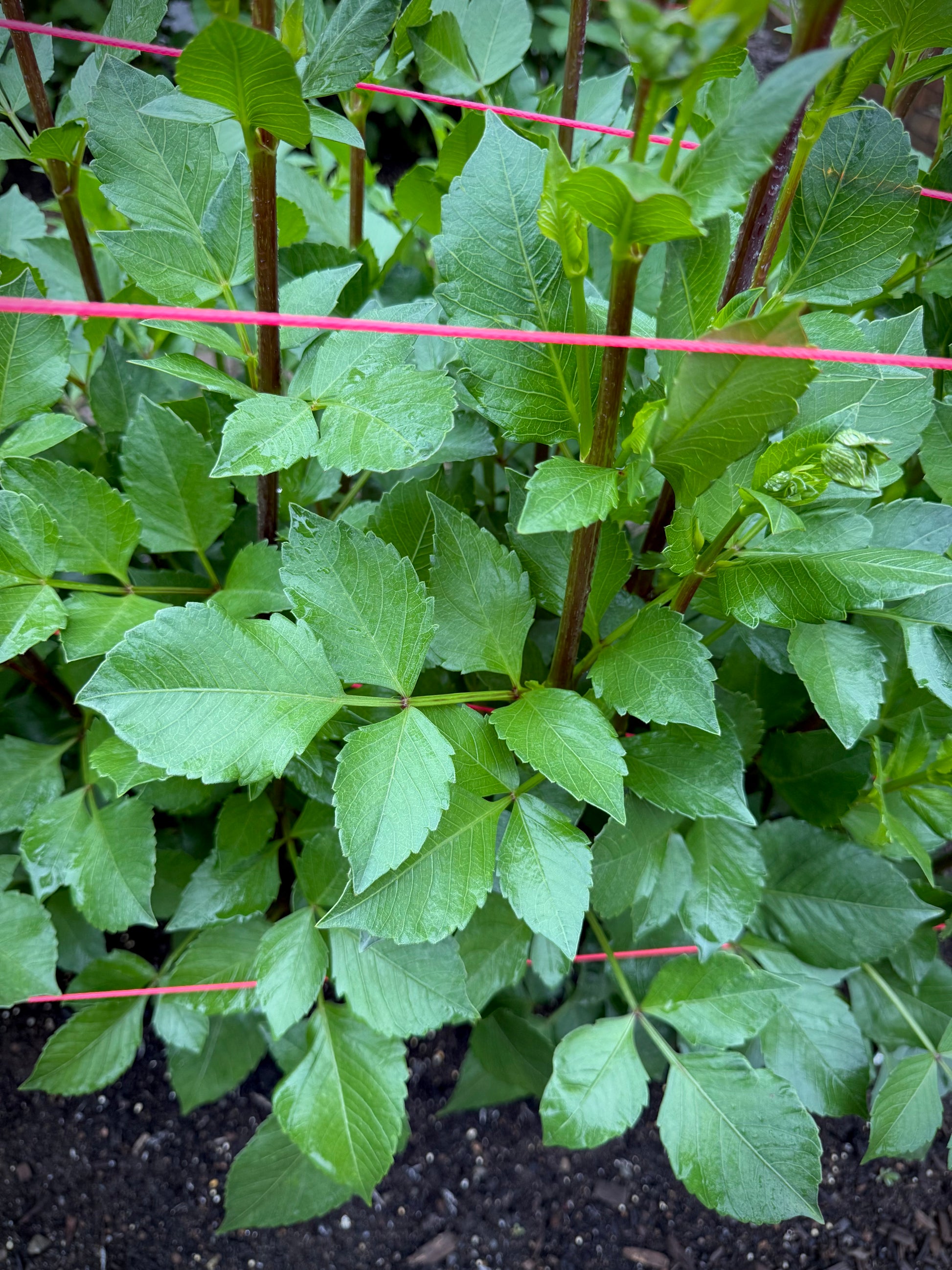 Bloomquist Ruby is pure perfection from the leaves to the 4 inch blooms. Ranges from a creamy magenta to lush purple depending on temperatures. Long, strong stems and the best cut flower. The leaves are stunning just by themselves, which is why I have a picture devoted to only them! Great tuber producer. Bloomquist Ruby will always have a permanent place in my growing list. Height 4’. Hybridized by Paul Bloomquist.