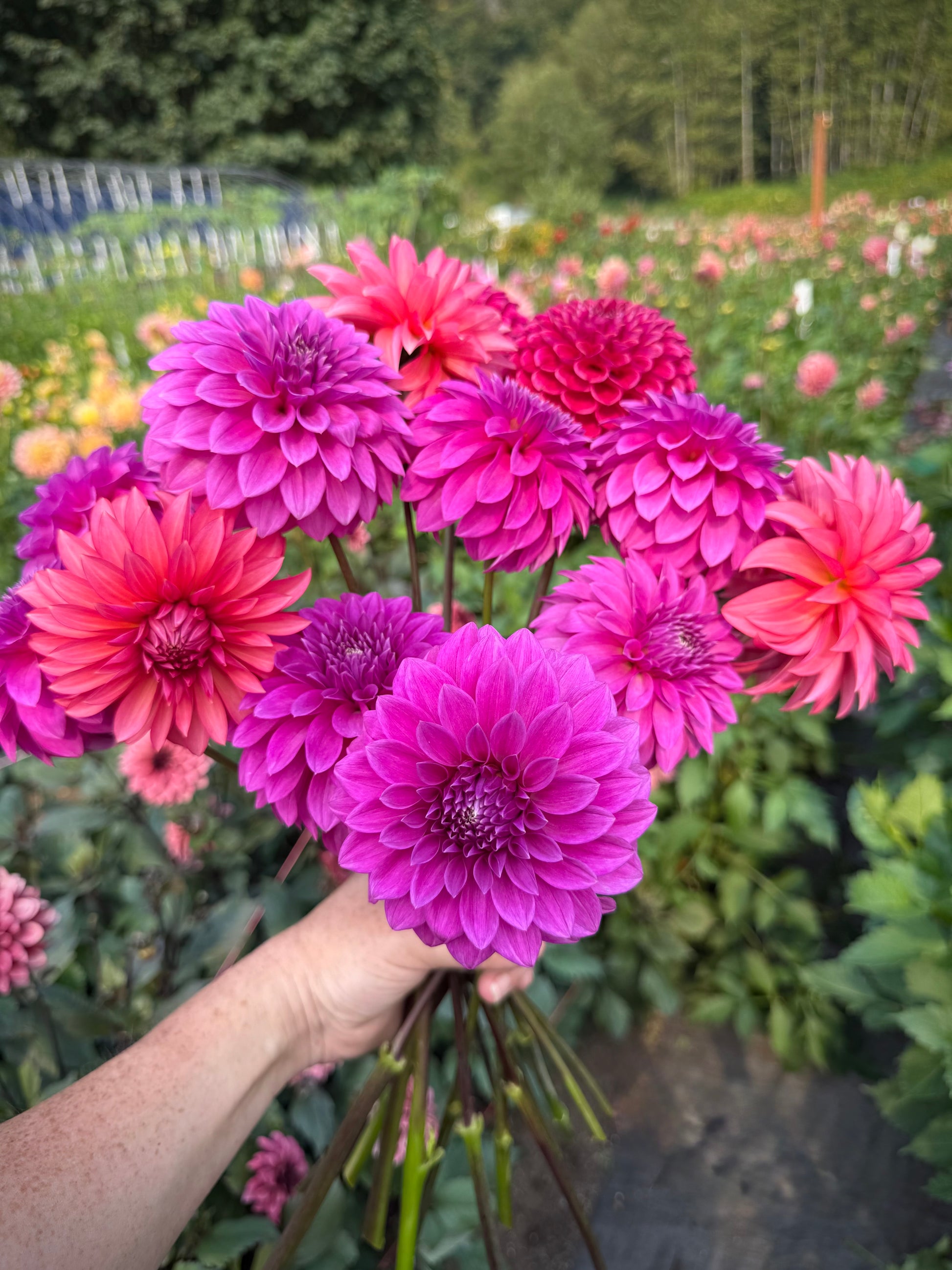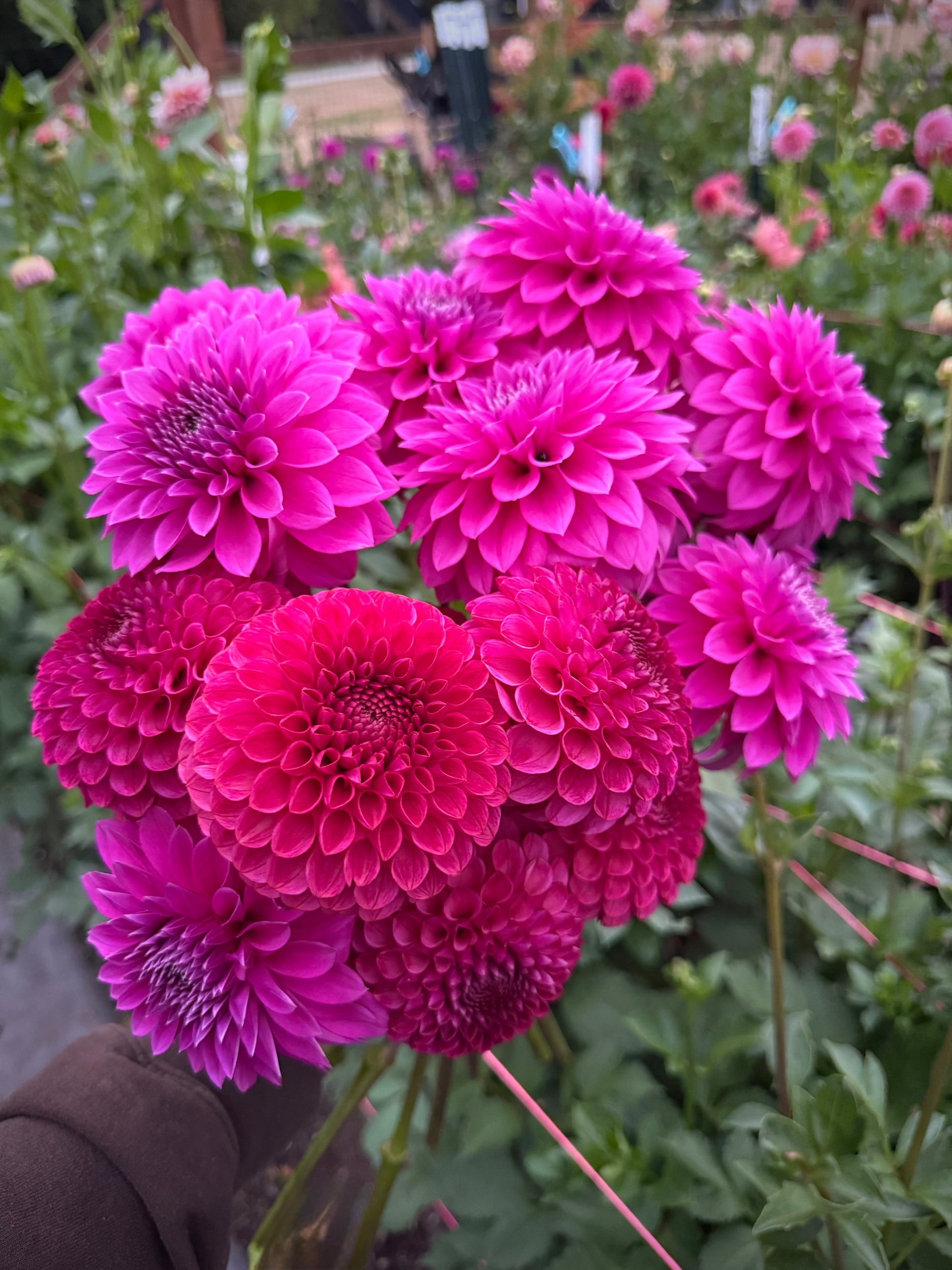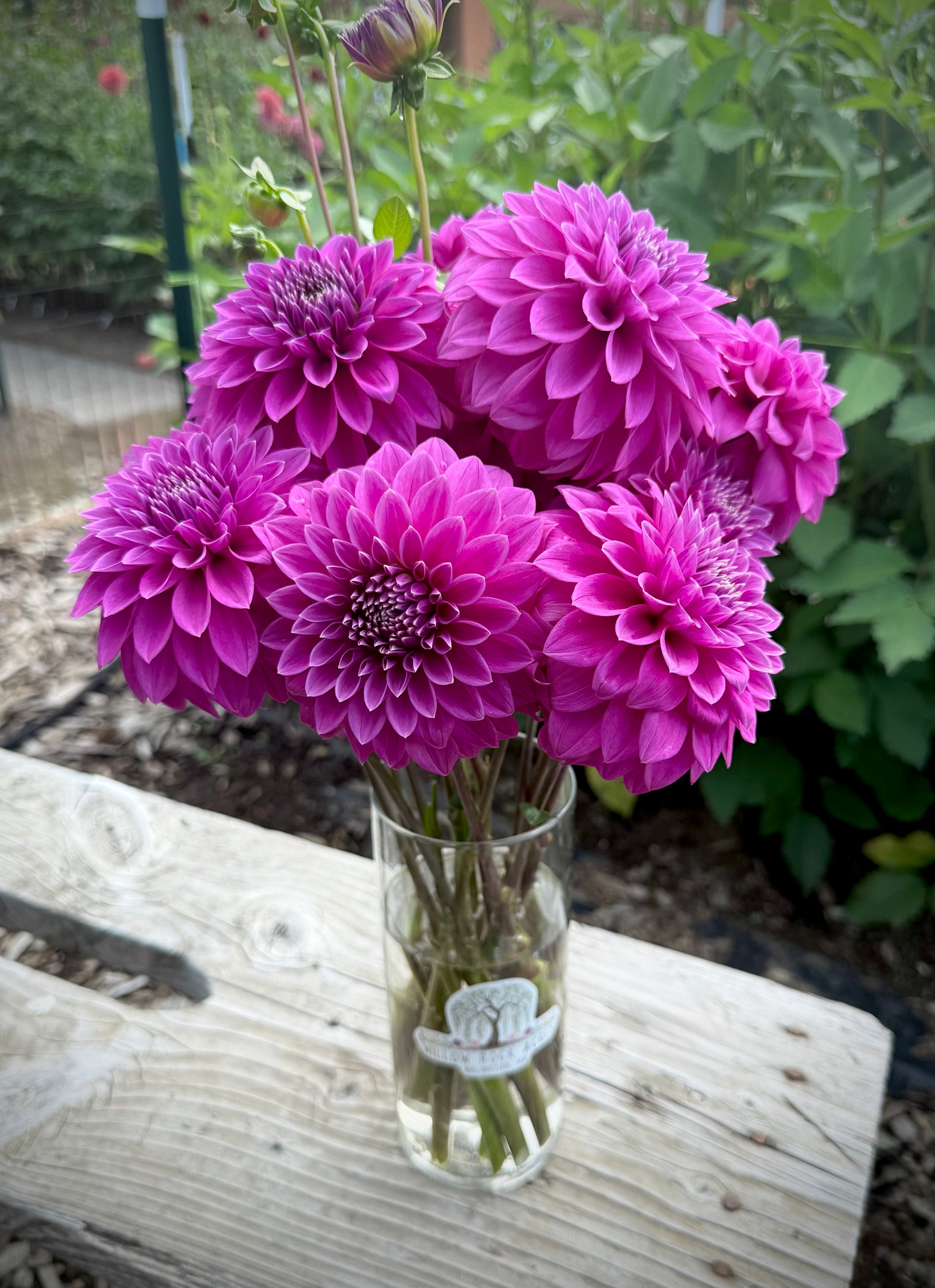 Bloomquist Ruby is pure perfection from the leaves to the 4 inch blooms. Ranges from a creamy magenta to lush purple depending on temperatures. Long, strong stems and the best cut flower. The leaves are stunning just by themselves, which is why I have a picture devoted to only them! Great tuber producer. Bloomquist Ruby will always have a permanent place in my growing list. Height 4’. Hybridized by Paul Bloomquist.