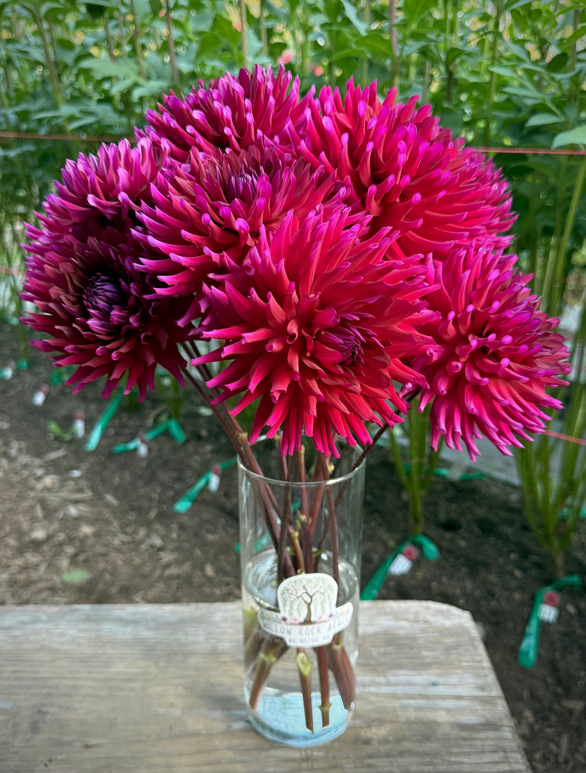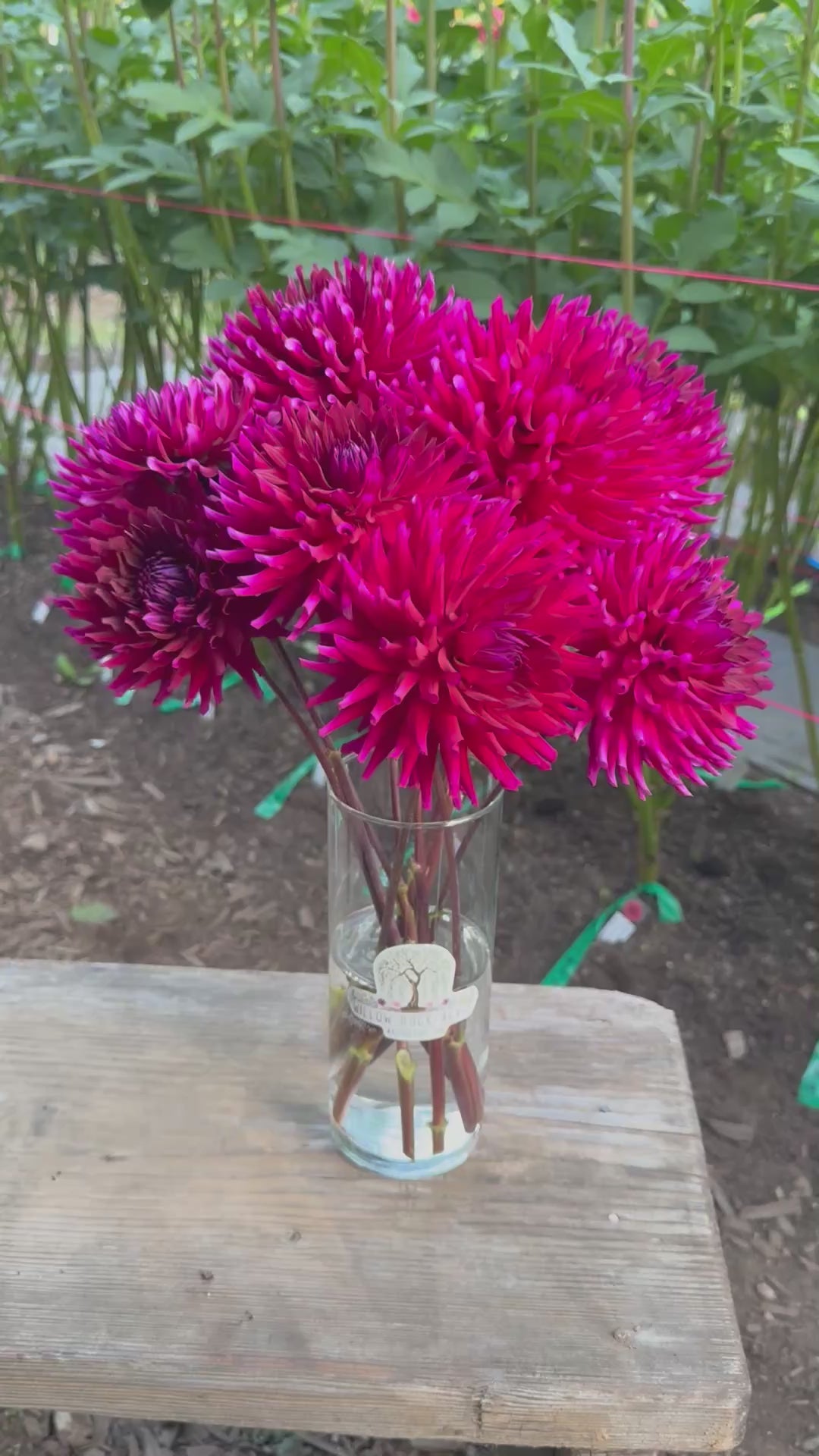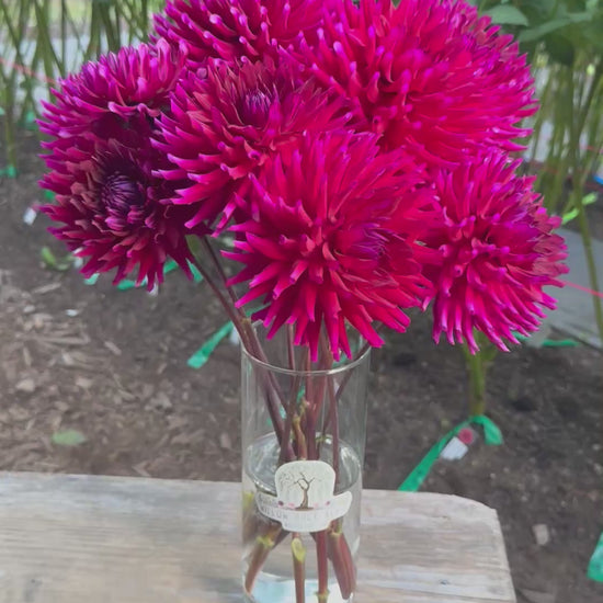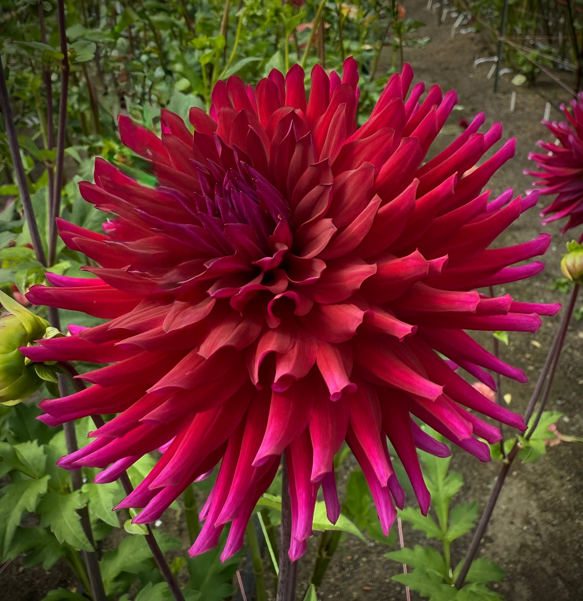 Inverted cactus large 6-8 inch blooms in dark blood magenta. Color varies slightly as the season progresses. Hybridized by Walk Jacenko.
