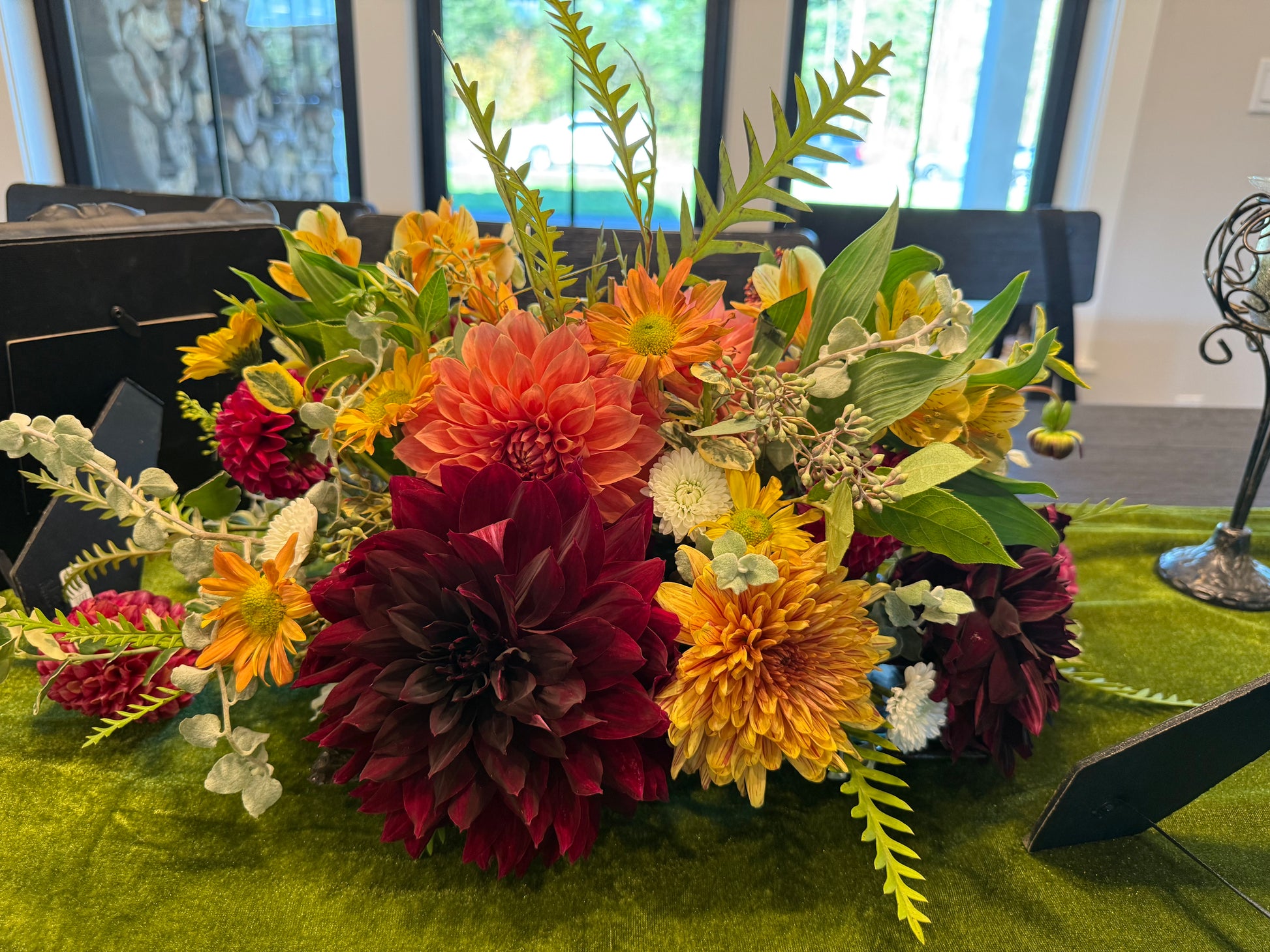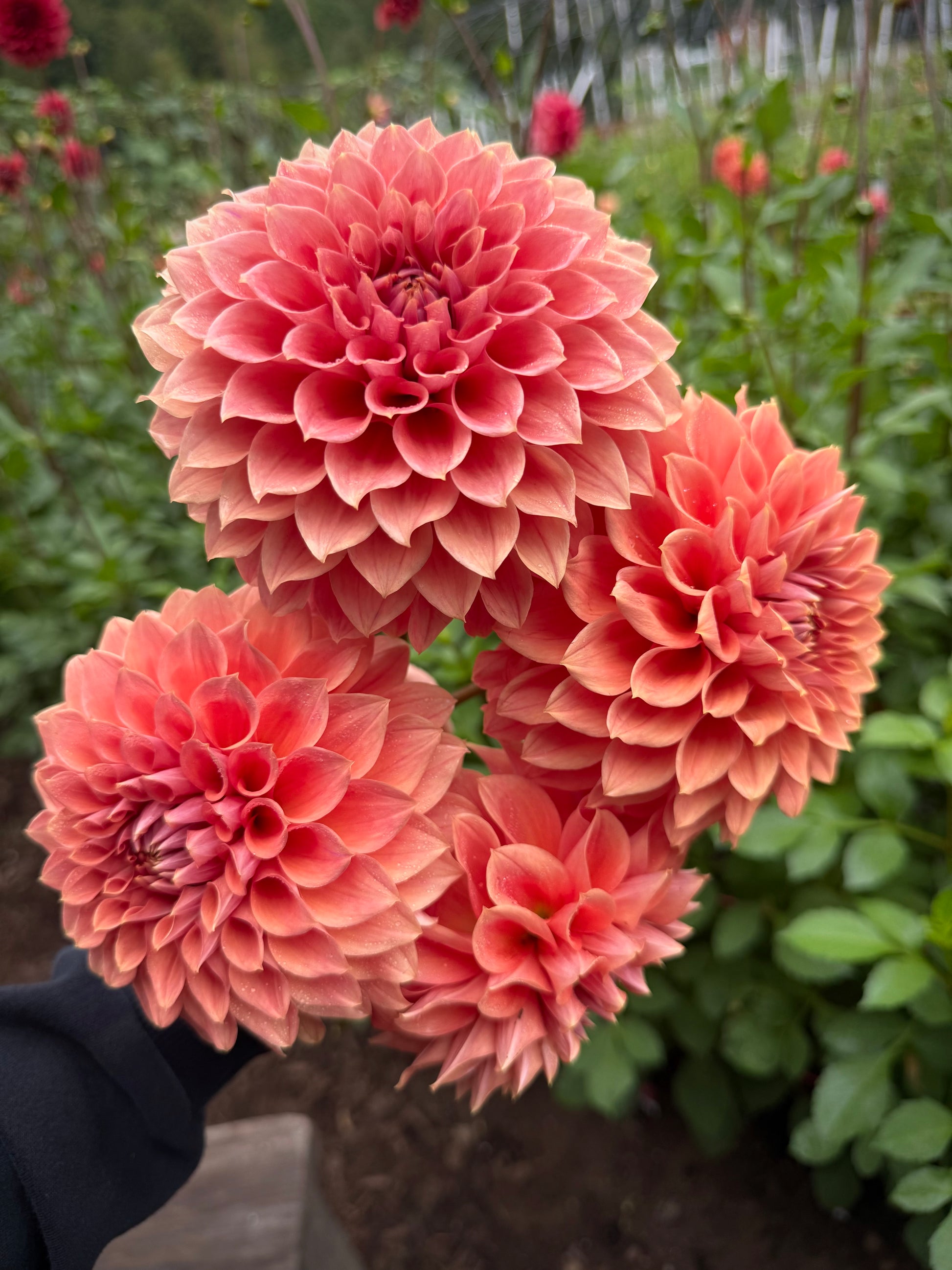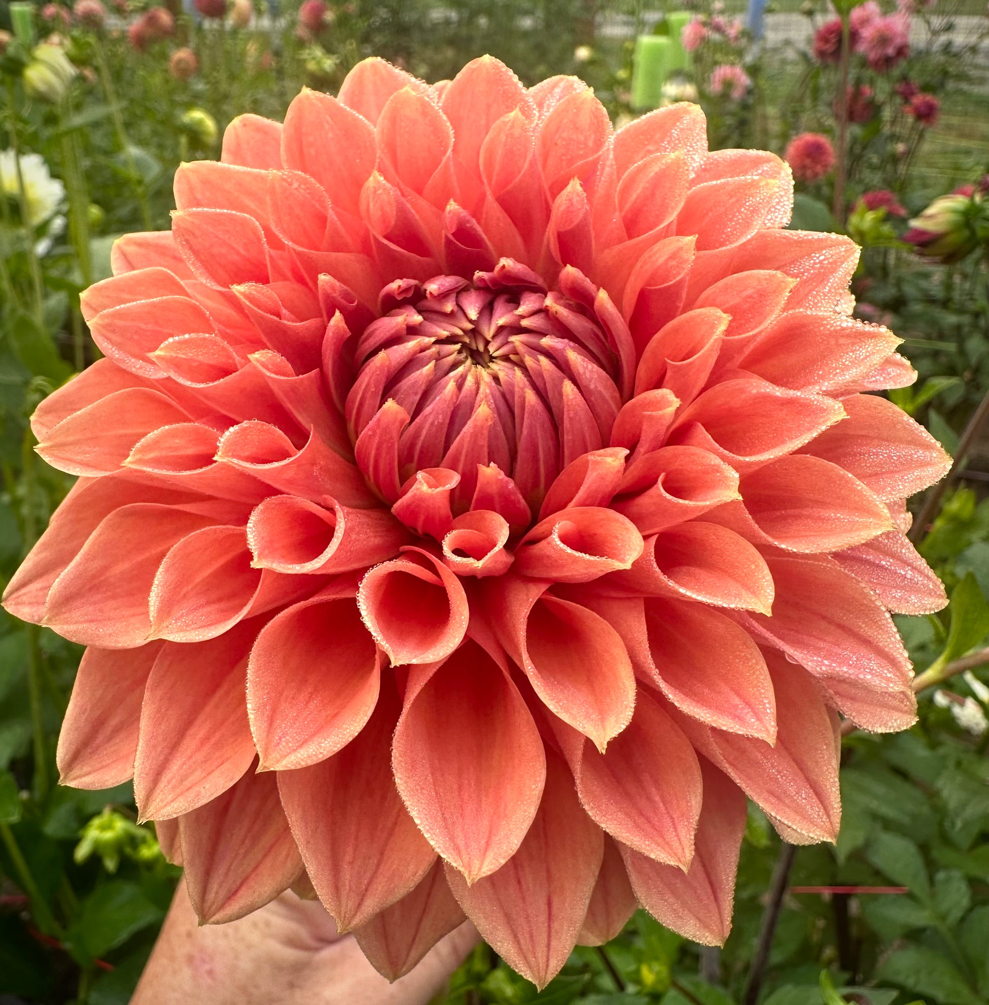 Beautiful terracotta colored 5 inch blooms. Great in arrangements. Petals face slightly inward with the perfect rolled form. Long, strong stems with a good vase life. Stunning in fall arrangements. Tried and true, great tuber producer that overwinter easily. Plant height 4’.