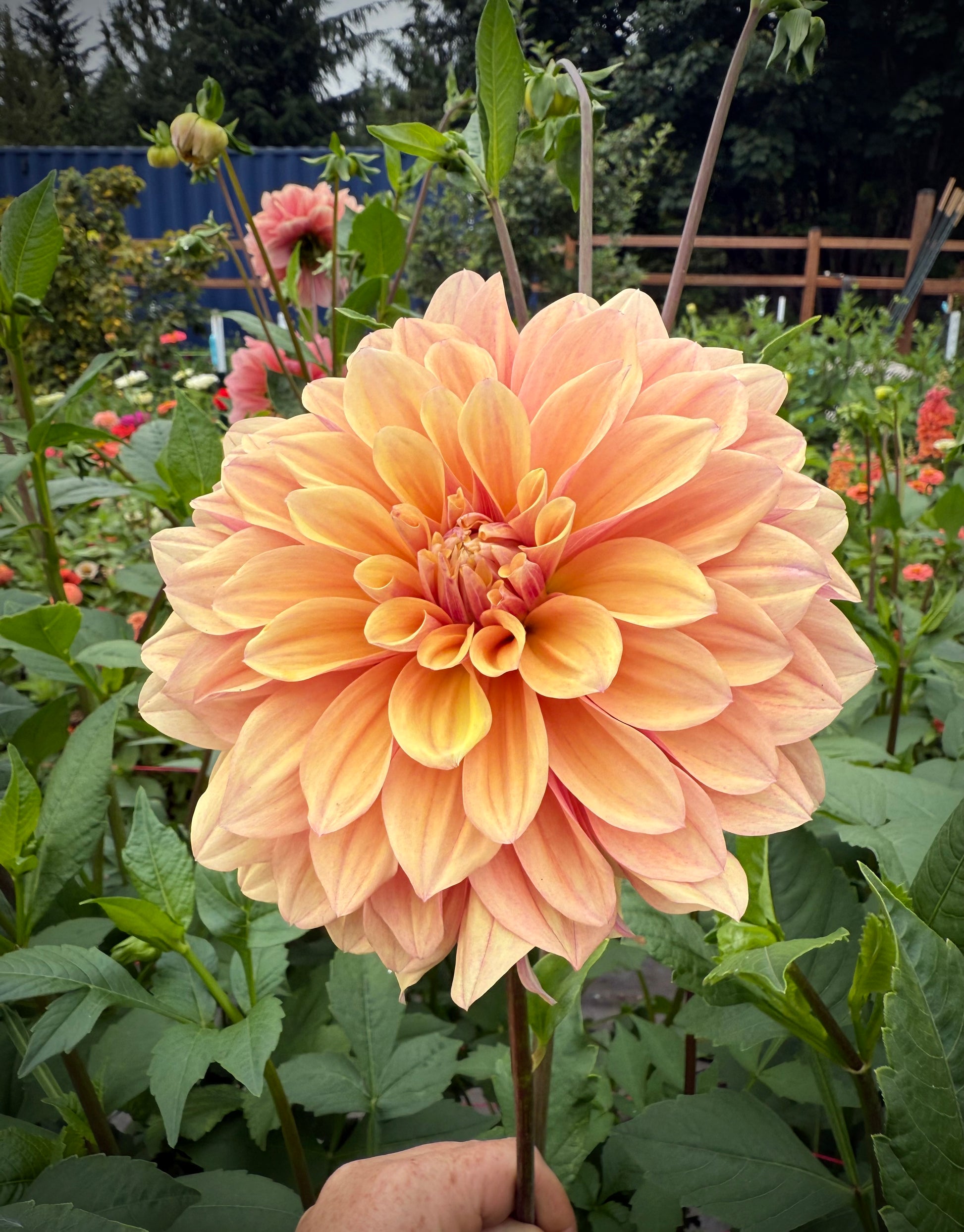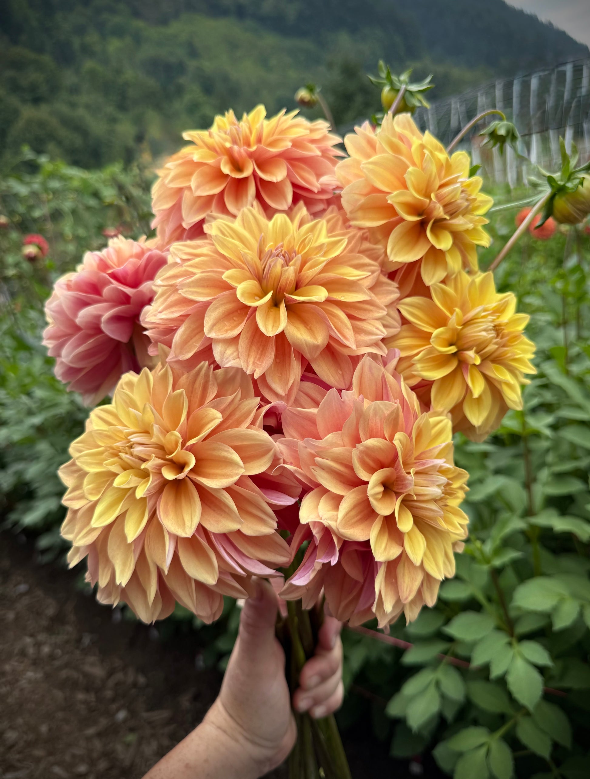 Lee’s Blue Sunday is dreamy. Blooms average 4-5 inches and have long stems. Colors range from rose gold to a sunset citrus peach. It’s a tall plant coming in around 5 feet, so make sure and cut deep when harvesting to keep the height manageable. 2025 Introduction hybridized by Lee Hemings Carlton of Goldenrod Gardens.