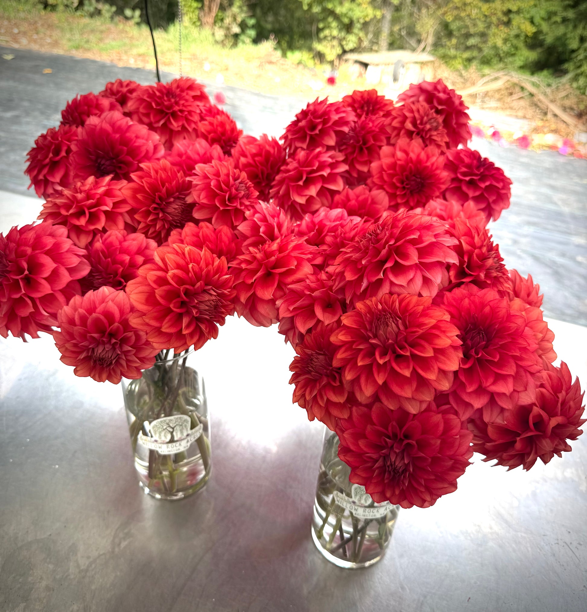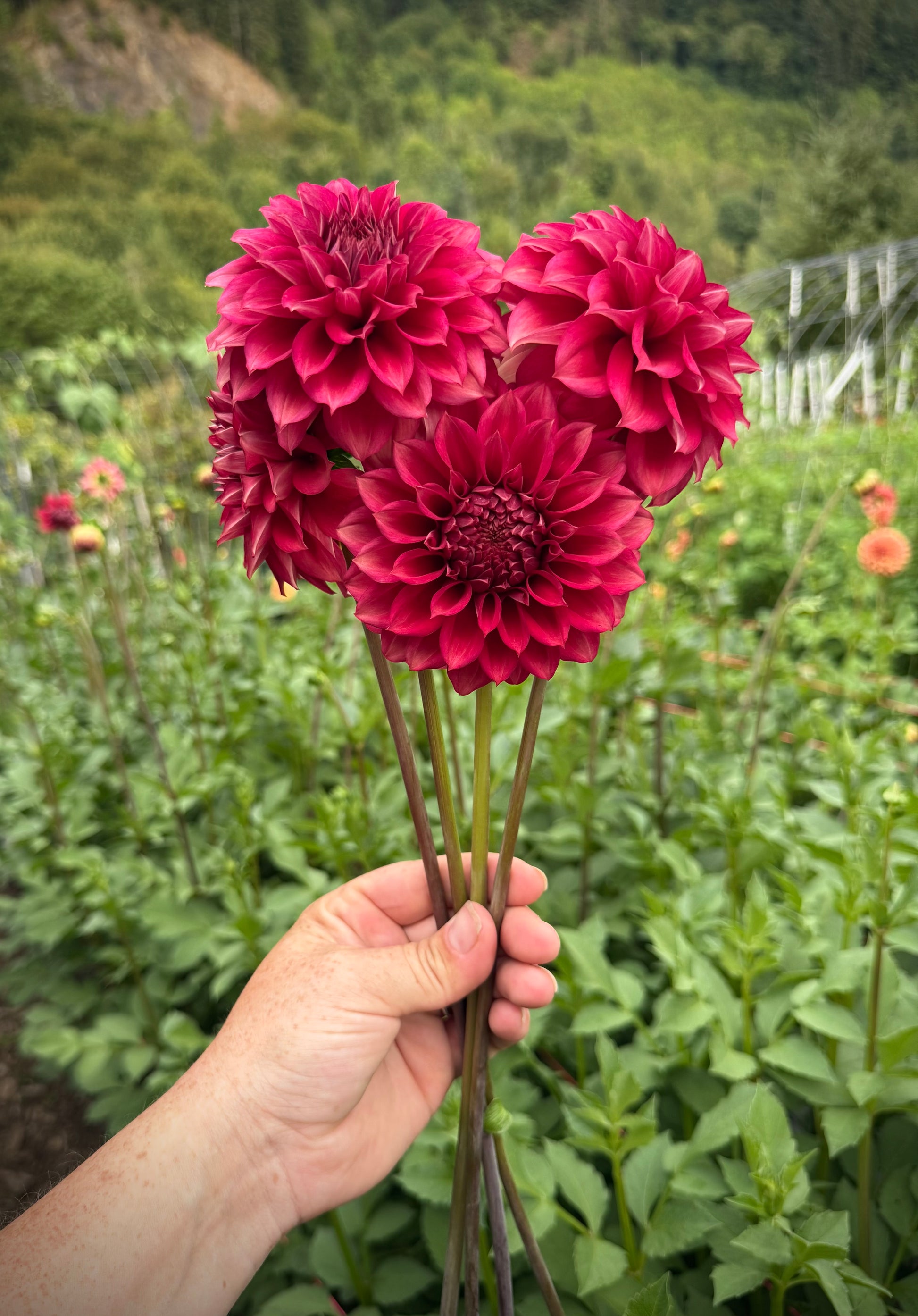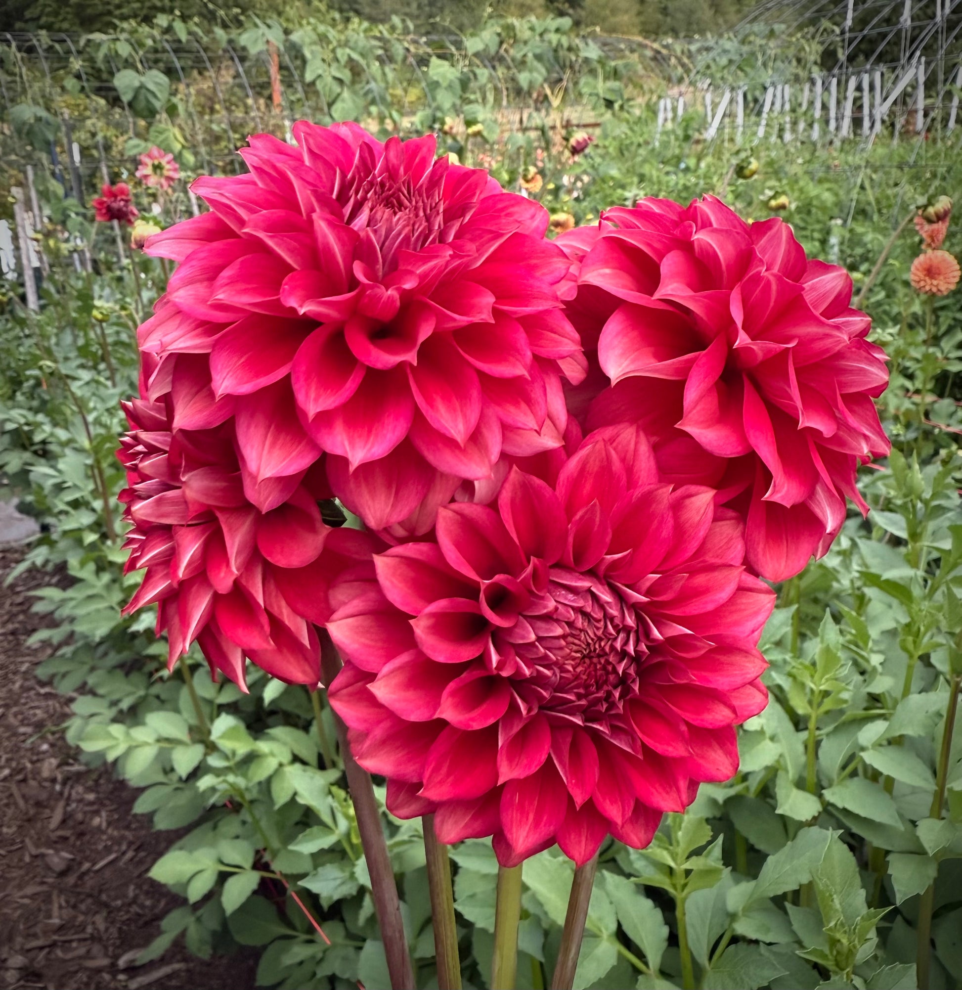 Lee’s Brick House is incredible. There isn’t one thing that isn’t impressive. Propagating cuttings from her was a breeze. The colors start out as a deep red and transition to a rusty brick red mid season. There is a video showing the stems. It is one of my favorites to harvest because it’s so easy. No stripping leaves… that is how long the stems are; and don’t bother disbuding. Every side bud gets those same long stems! Almost every bloom sits around 45° with only one here or there that is clock faced.