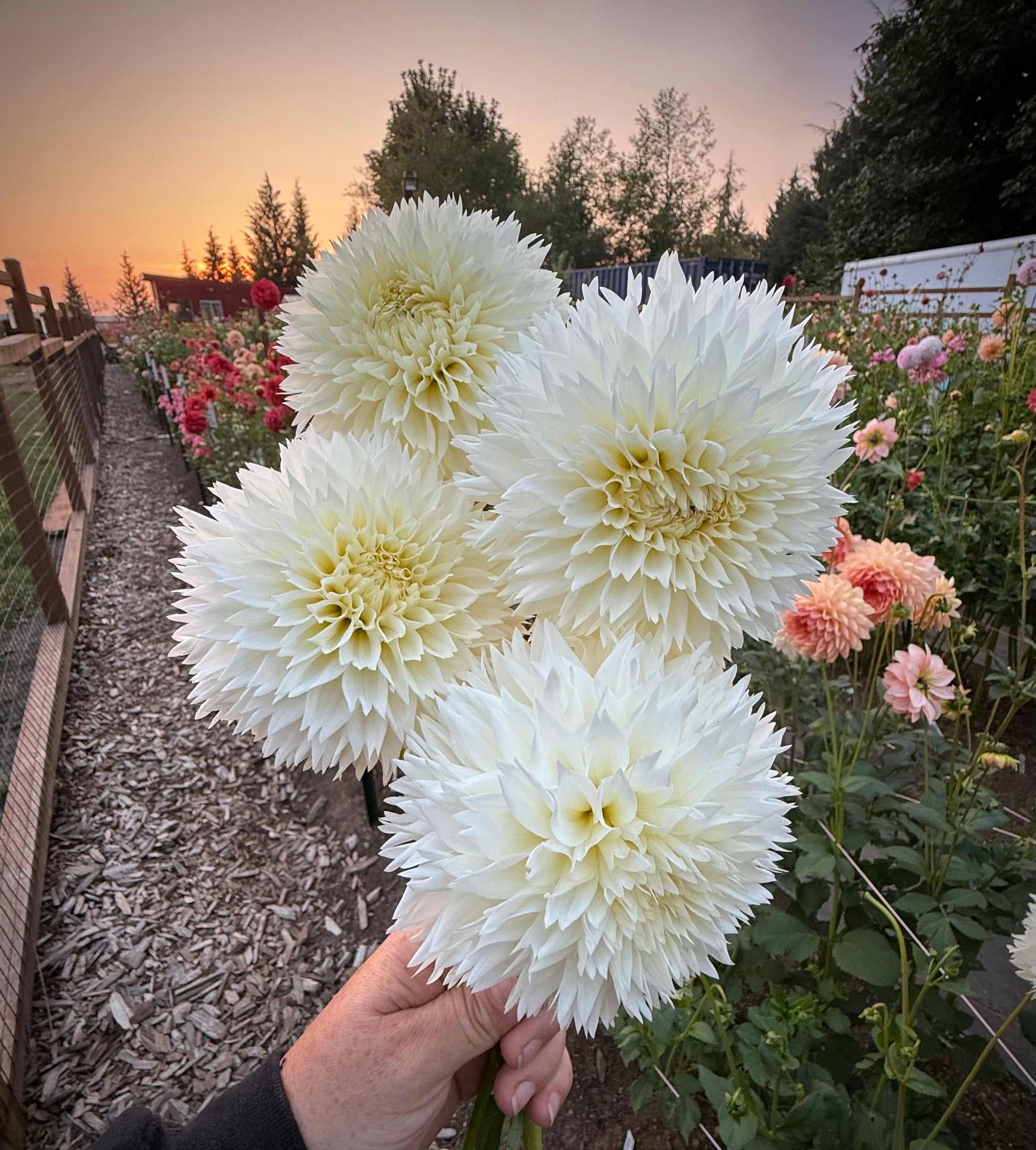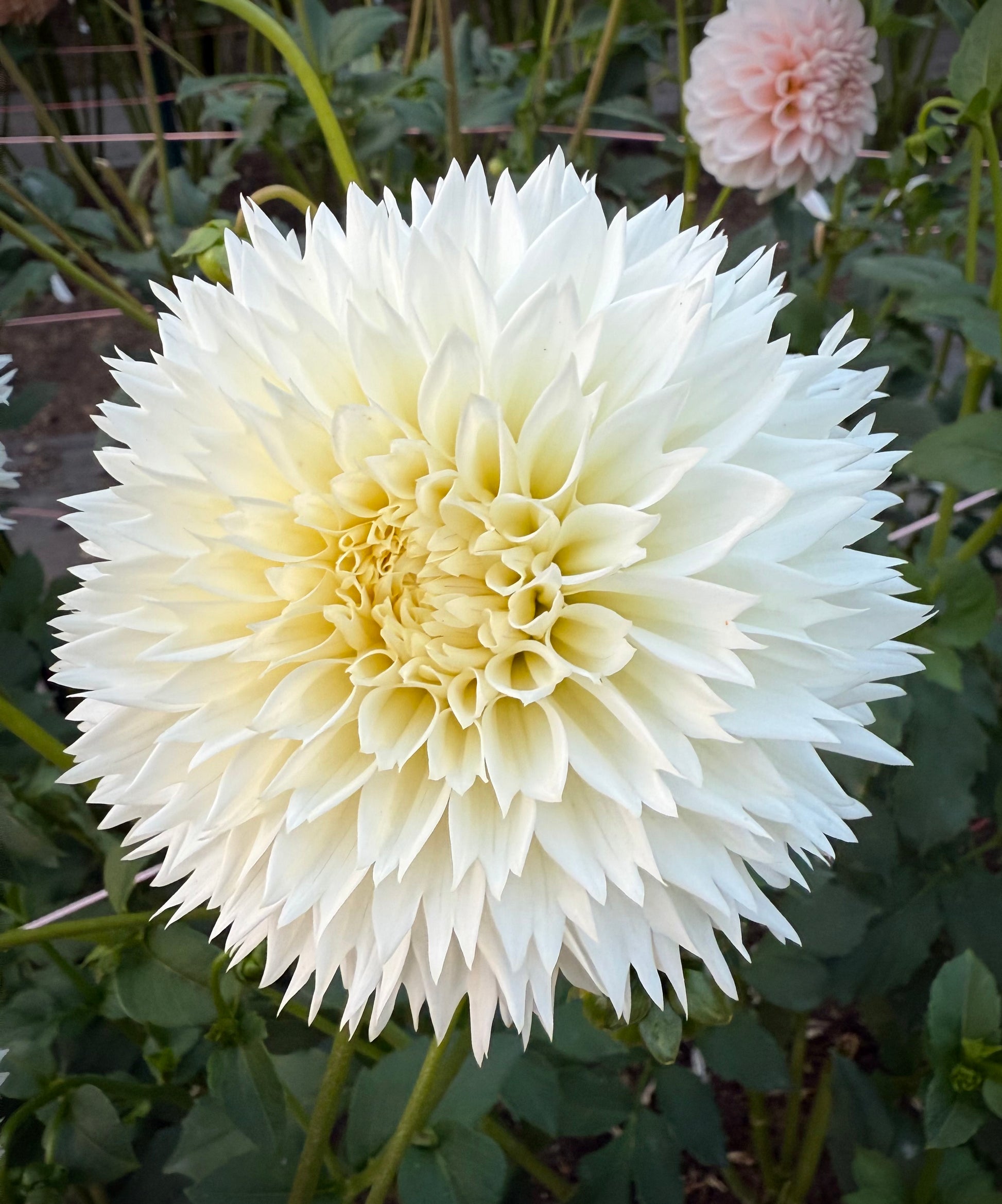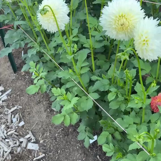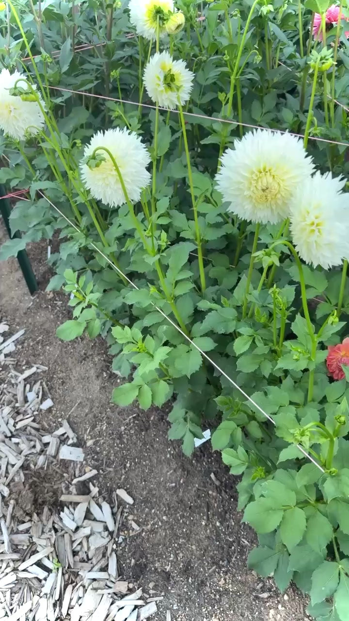 Coconut Fizz is a beautiful white 4 inch bloom on compact plants. High petal count blooms that changed a bit for me throughout the season. During the hottest parts of the season they were consistently clock facing with weaker stems. Disbudding and cutting deep helps with stem strength. Plant height 3’. Hybridized by Lee Hemings Carlton of Goldenrod Gardens and introduced in 2024.
