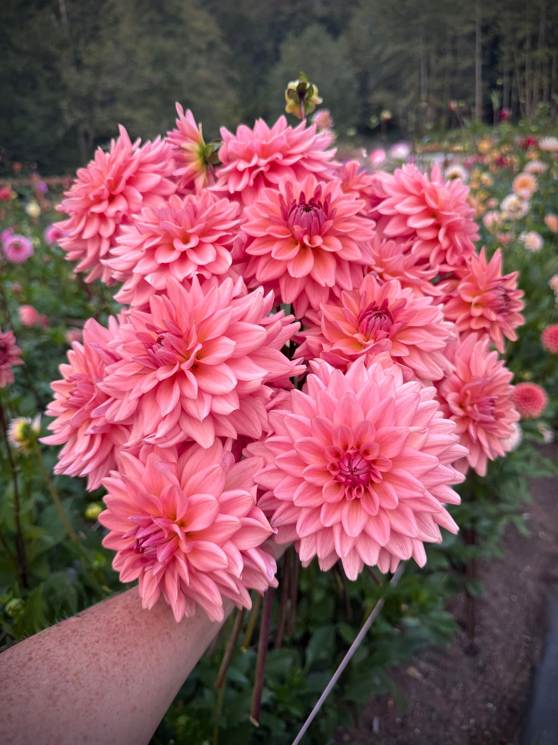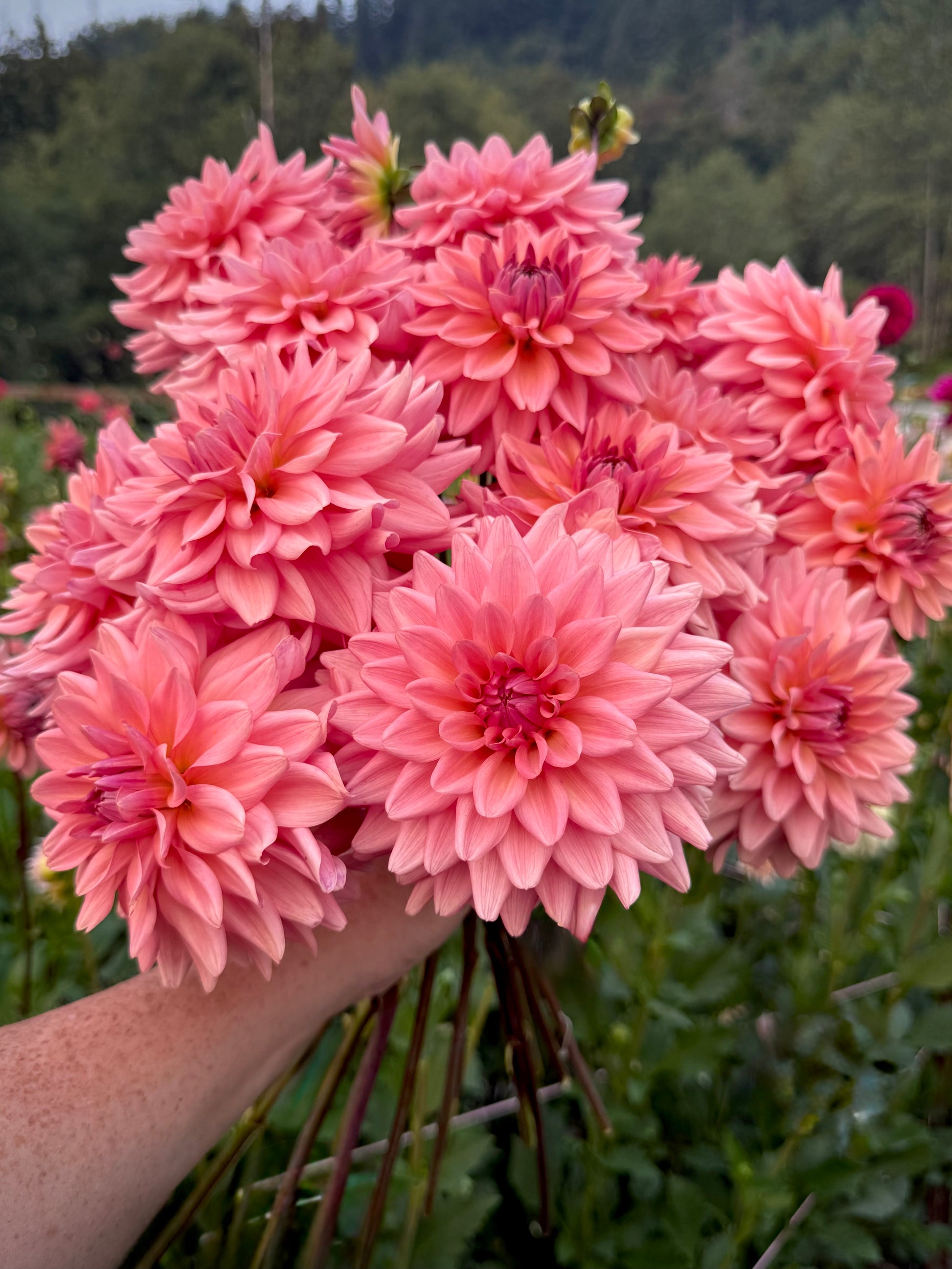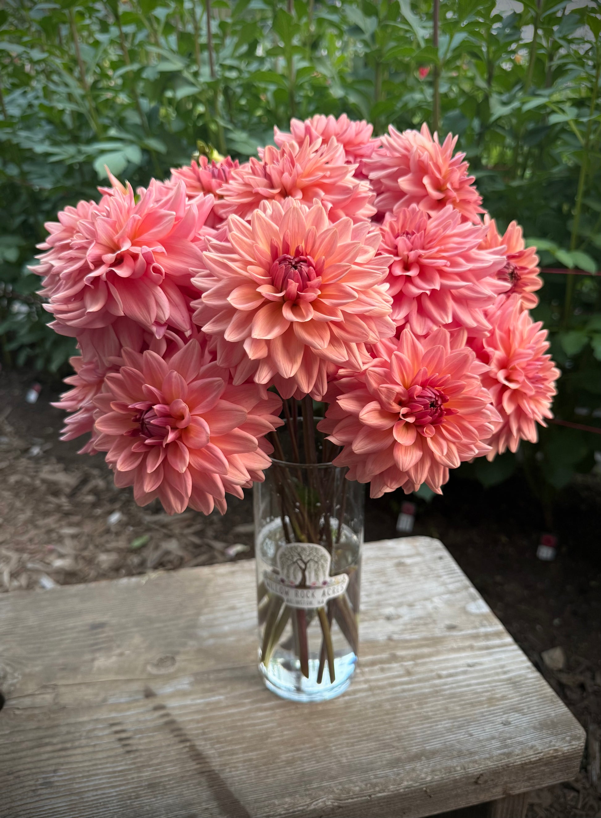 This cheerful 3 1/2 inch beauty glows in the garden and absolutely shines in a bouquet. The blooms are full and perfectly formed, with soft, layered petals that blend shades of peach and copper. Each flower has a warm, sunlit quality that photographs beautifully and brings instant happiness to any arrangement. Strong, upright stems and great bloom consistency make this one a dream for cutting and production alike. Color shifts slightly as temperatures fluctuate between muted beauty to vibrant color. Plant height 4’. Hybridized by Lee Hemmings Carlton of Goldenrod Gardens and released in 2023.