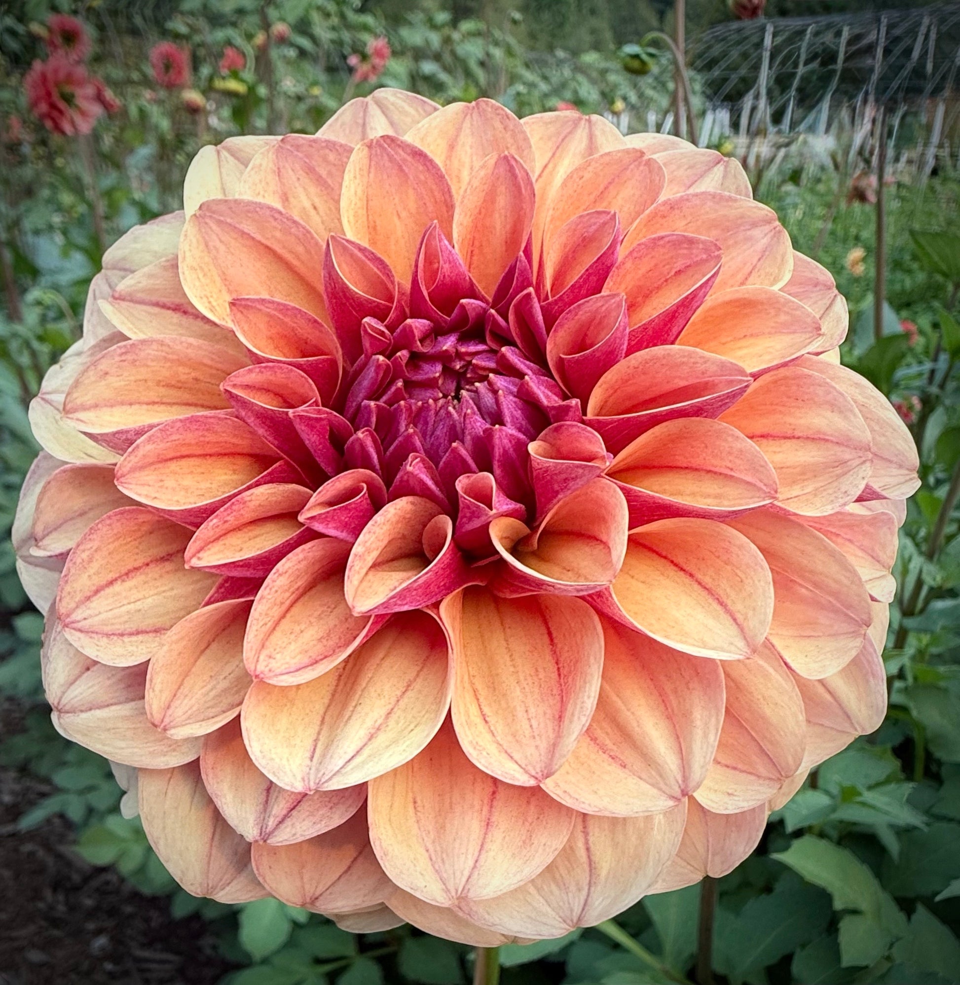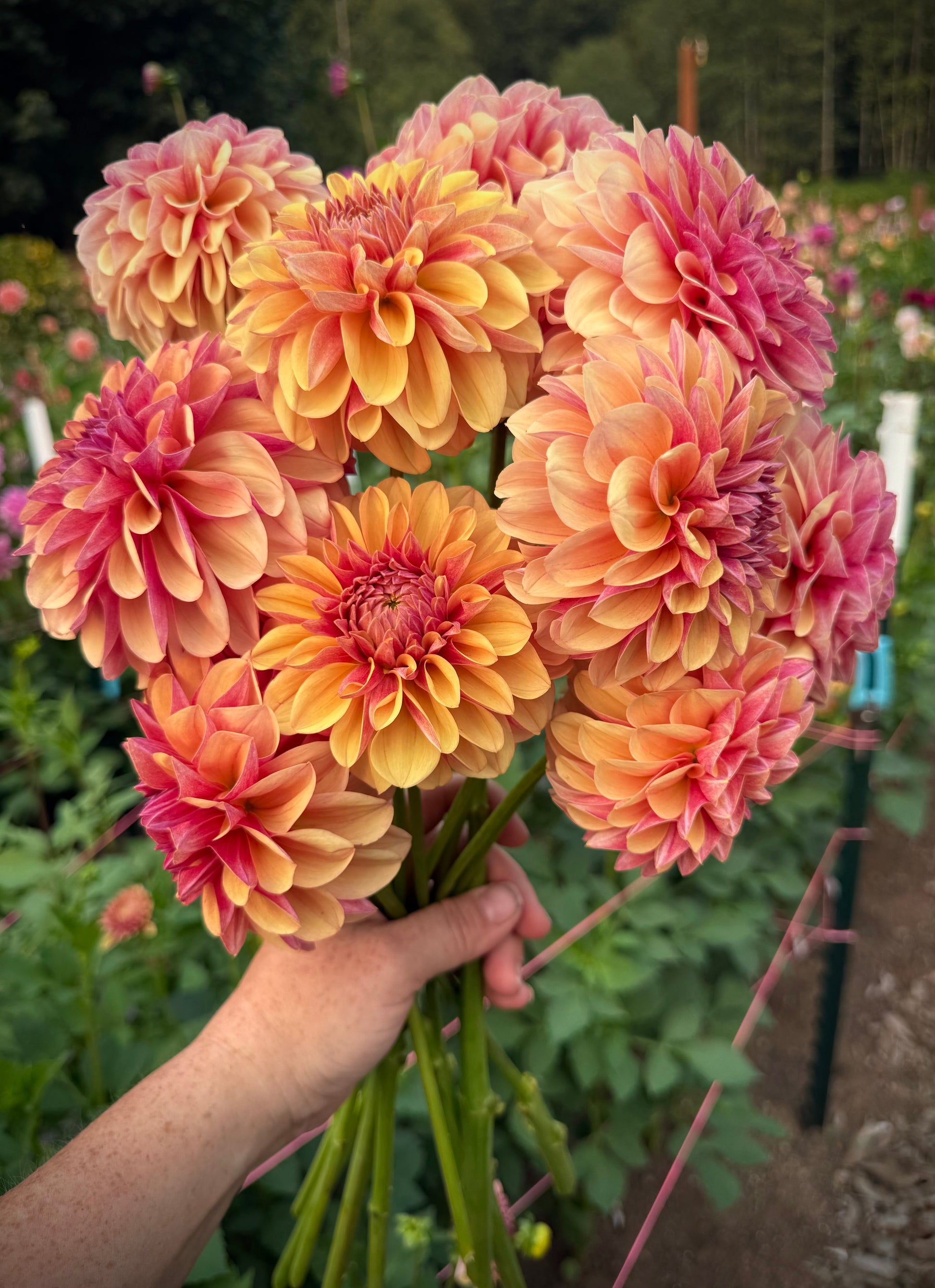 This warm, 3 inch sun-kissed beauty glows in shades of golden apricot, peach, and raspberry rose petal reverse. Each bloom opens with buttery yellow centers that blend into soft coral and finish with a flush of pink on the outer petals; a true sunset in flower form. The blooms are perfectly shaped and consistent, making them a standout both in the garden and in arrangements.A strong, reliable grower with excellent stem length and vase life, Lee’s Golden Raspberry is a must-have for anyone who loves rich, romantic color palettes. Plant height 4’. Hybridized by Lee Hemings Carlton of Goldenrod Gardens.