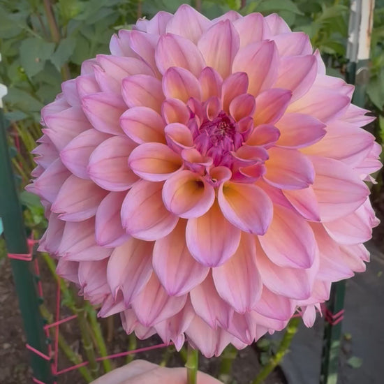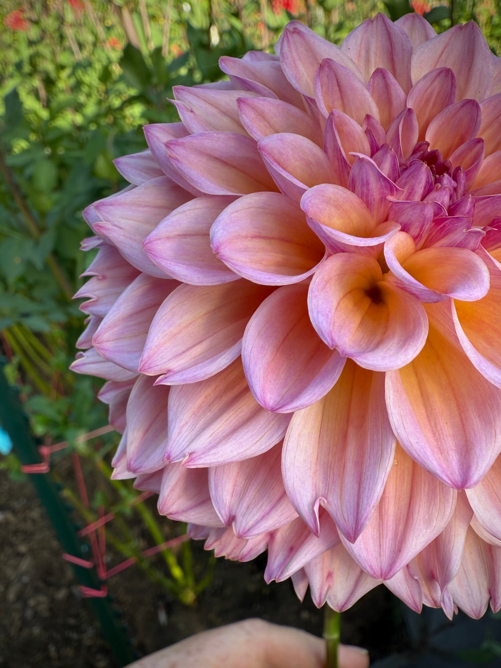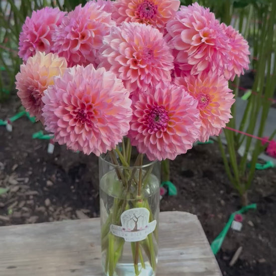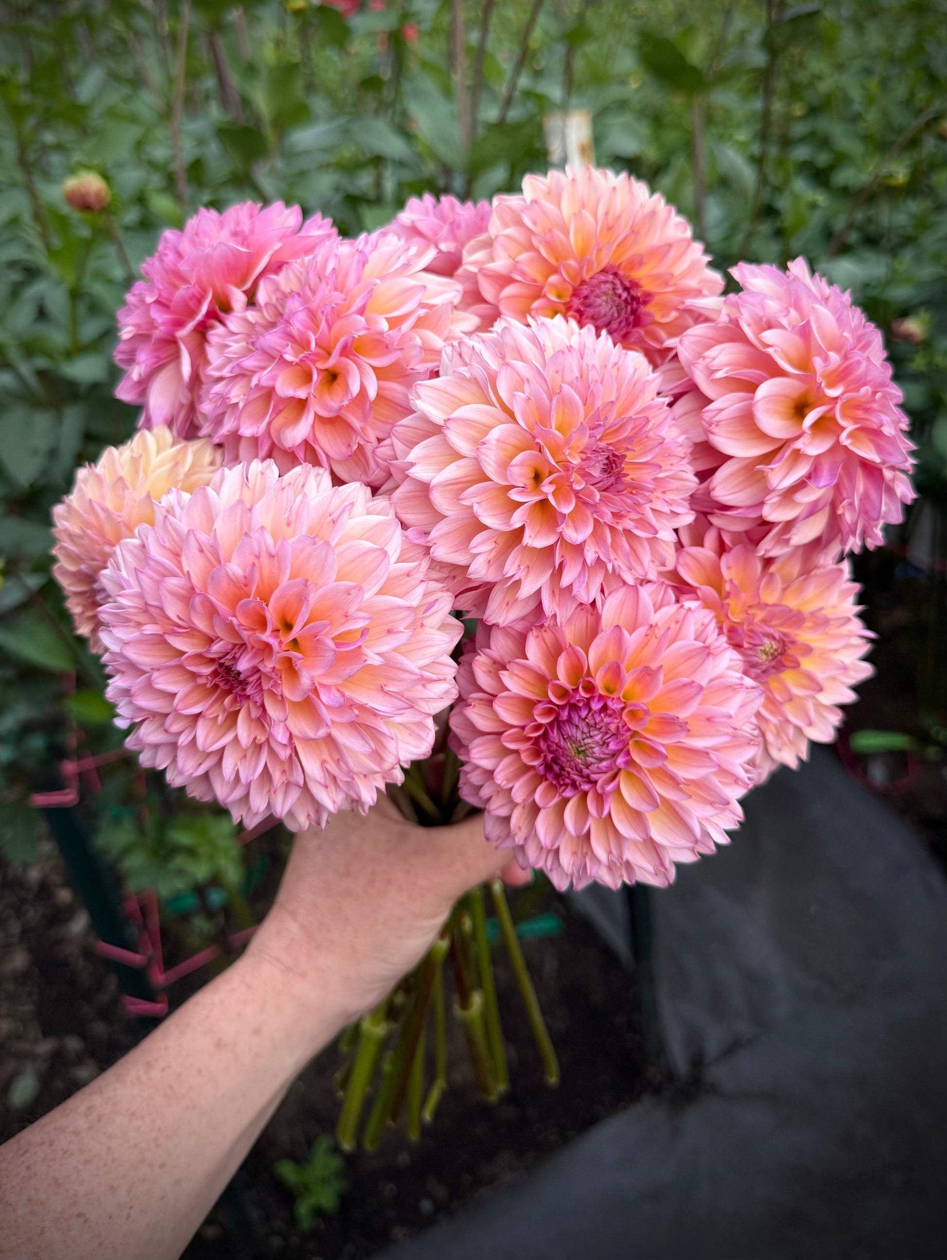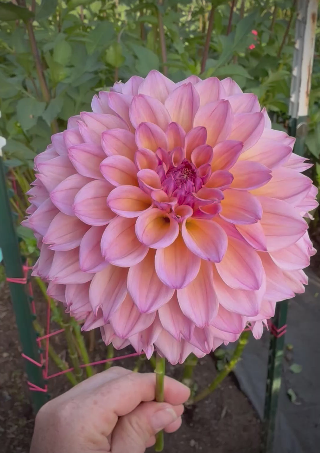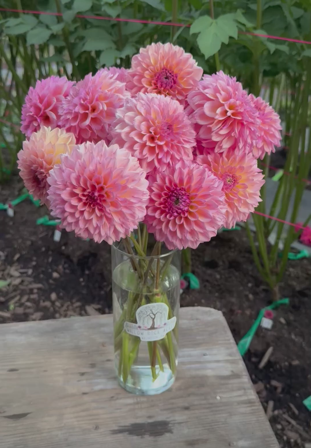 Meet Lee’s Punch Drunk Love! This gal checks all the boxes for me. First, she is a rooting machine. The easiest of all my dahlias to propagate, which is why I was able to plant so many of her this past season. My favorite quality of the 3-4 inch blooms are the petals. As the petals age, they become lacinated with little dark dimples near the petal splits. It’s such a unique trait of a dahlia, and I get comments on how attractive it is constantly. The color is a rosy sunset pink with a peach petal base and dark magenta accents. Great bloom connection and long, strong stems. Consistent bloomer all season long. She’s a keeper. plant height 5’. Hybridized by Lee Hemmings Carlton of Goldenrod Gardens and released in 2024.