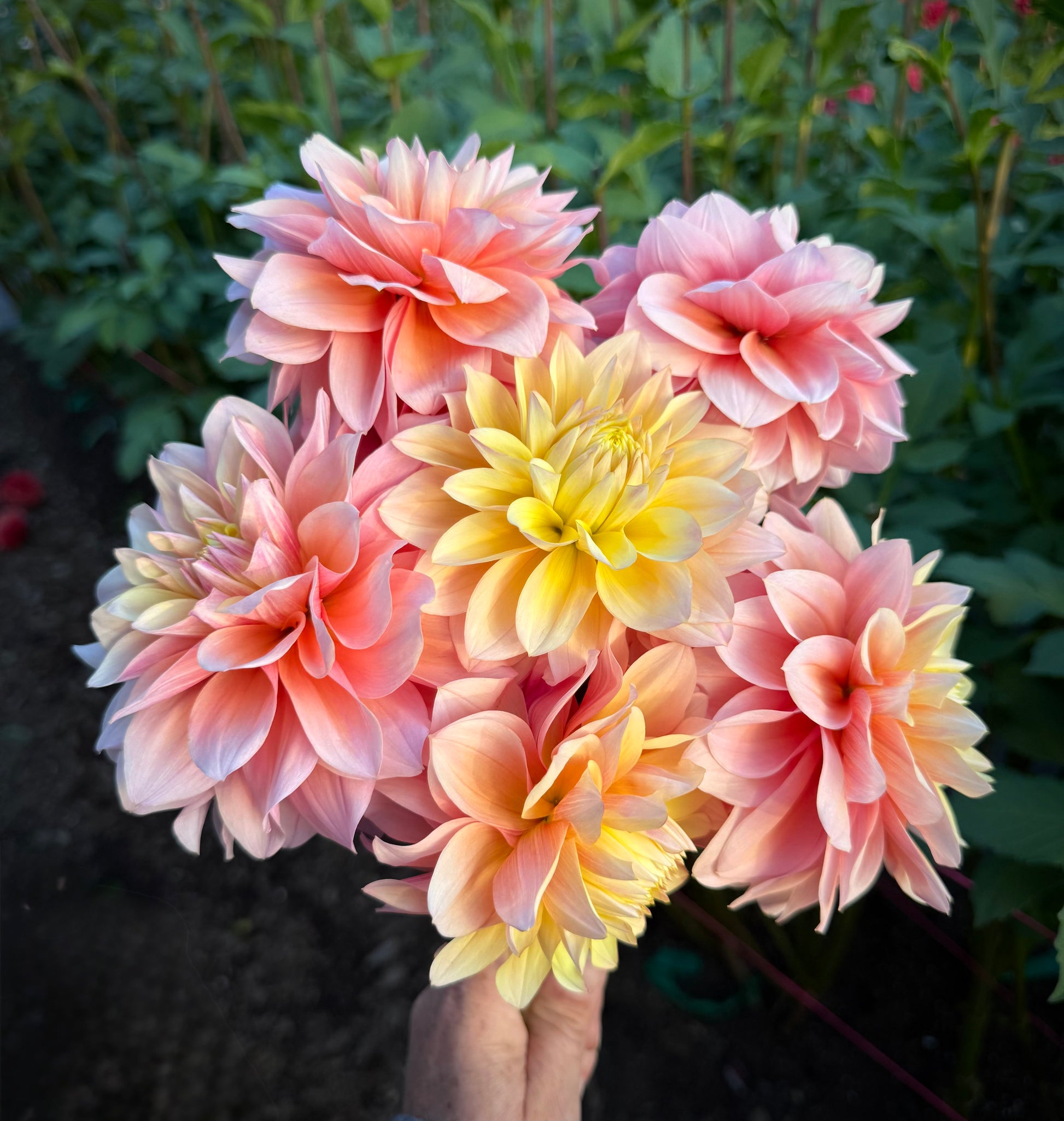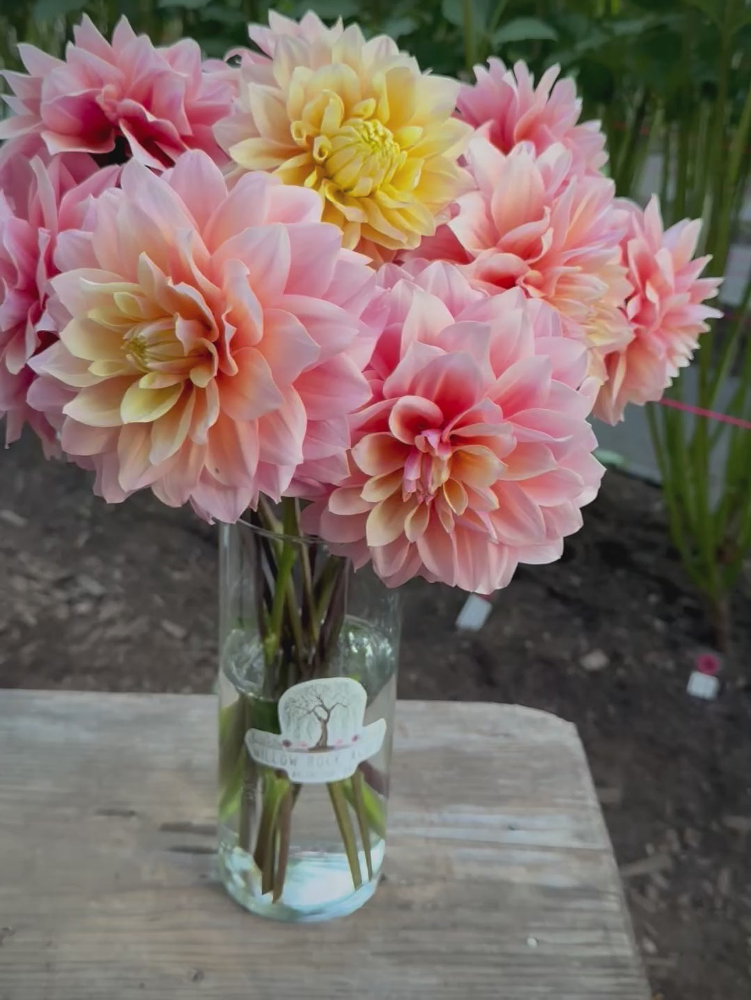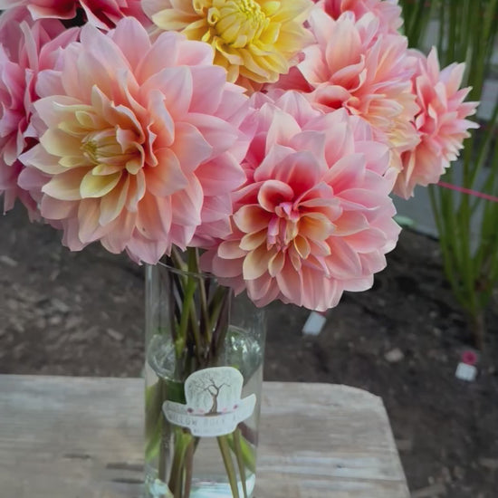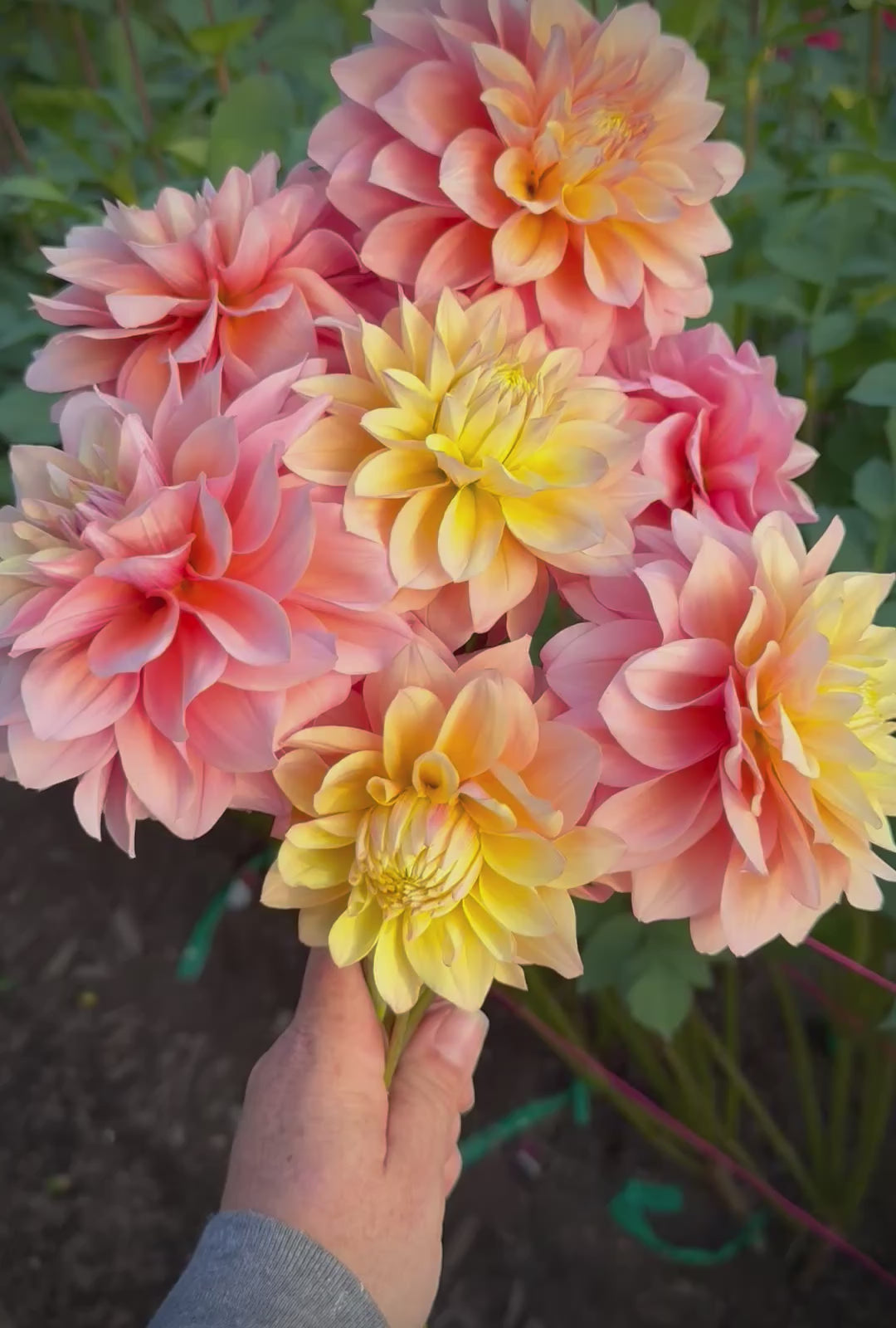 Stunning 5 inch blooms on a 5 ft. Plant. Twisty petals in the most perfect blush pink, peach and coral tones. Extremely long stems and an amazing cut flower. A must grow for me. Tuber production is one of the best in the garden, even from cuttings! Hybridized by Lee Hemmings Carlton of Goldenrod Gardens and released in 2023.