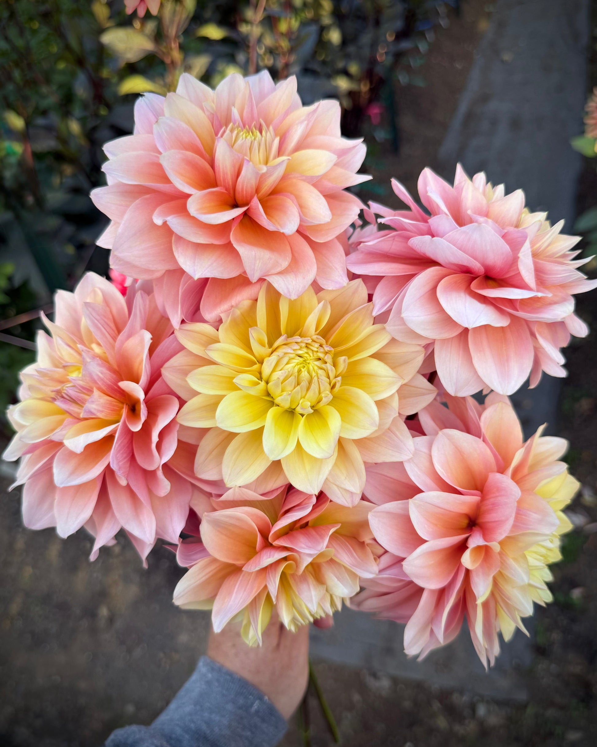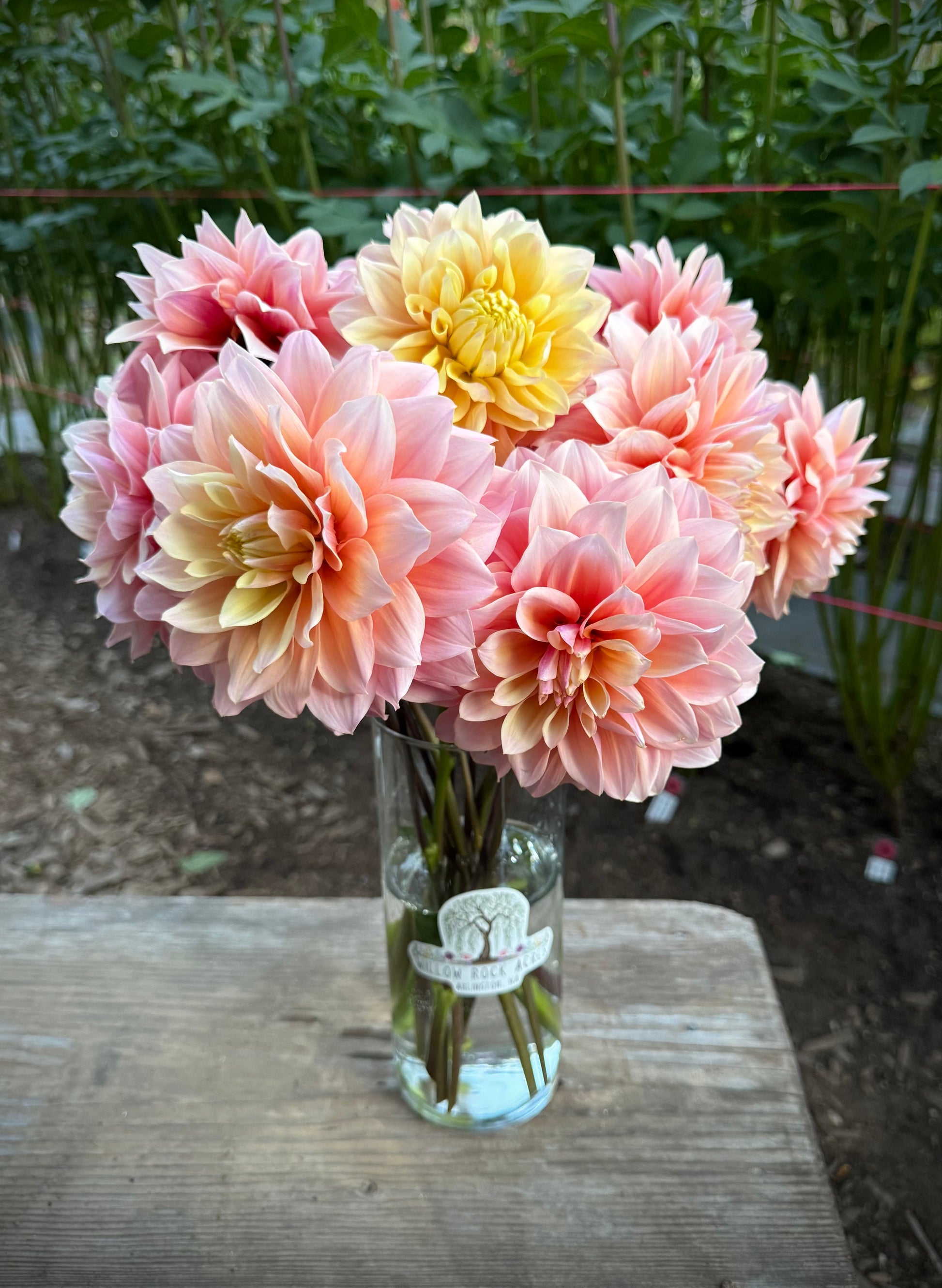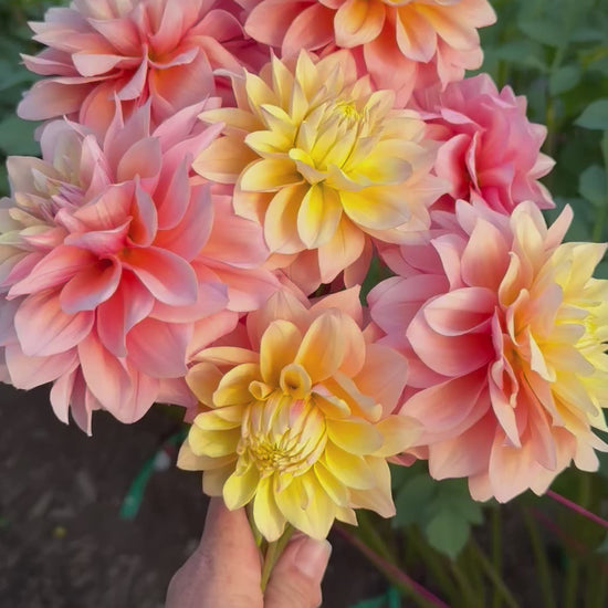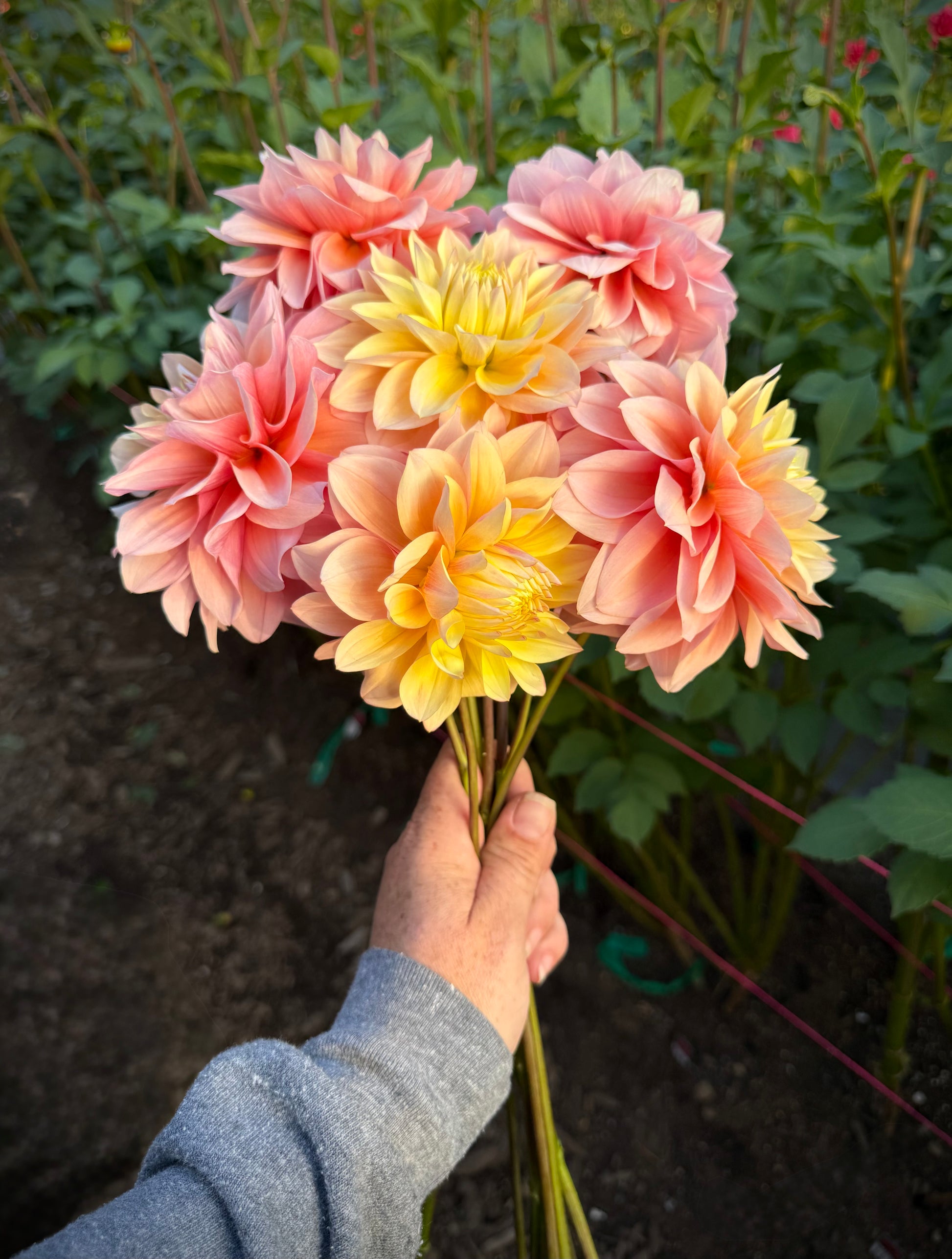 Stunning 5 inch blooms on a 5 ft. Plant. Twisty petals in the most perfect blush pink, peach and coral tones. Extremely long stems and an amazing cut flower. A must grow for me. Tuber production is one of the best in the garden, even from cuttings! Hybridized by Lee Hemmings Carlton of Goldenrod Gardens and released in 2023.