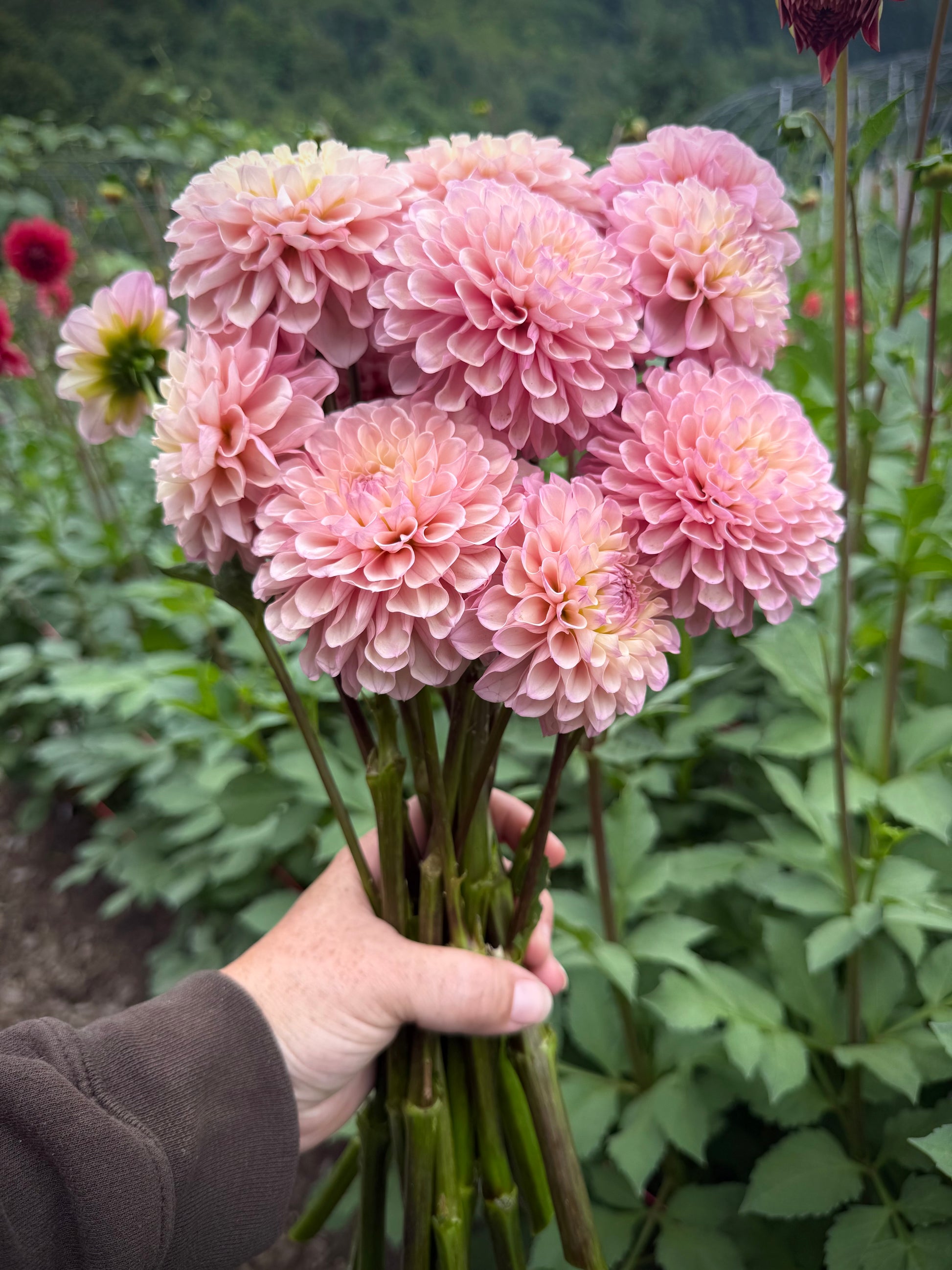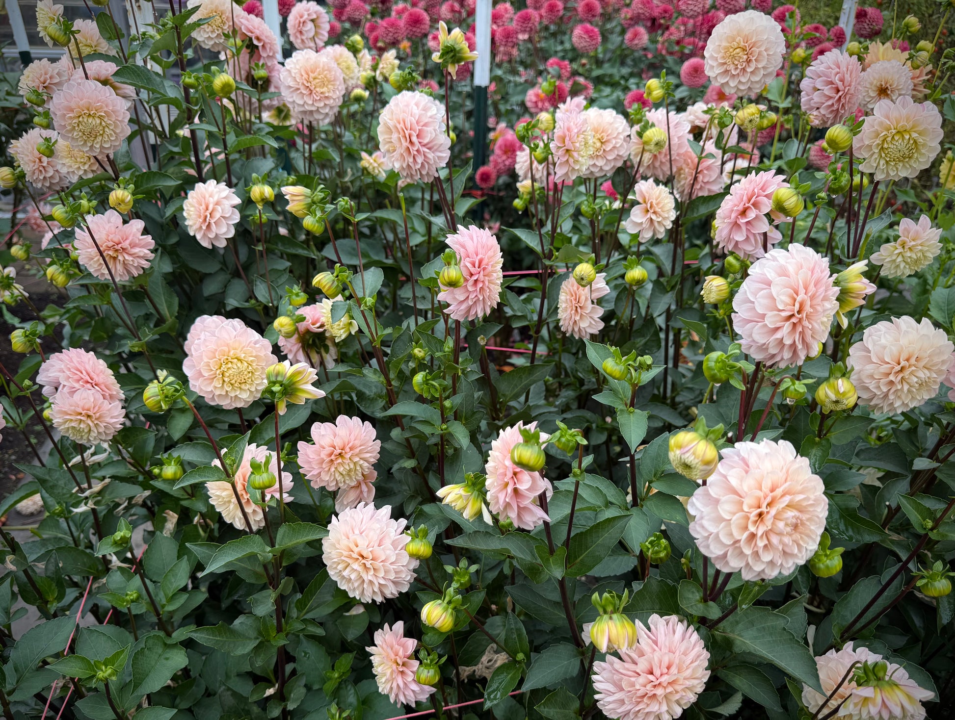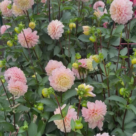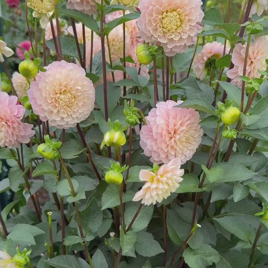 Beautiful and elegant 3.5 inch blooms in a perfect blush cream that works perfectly for floral arrangements. Color changes slightly throughout the season between blush pink, to almost full cream. Petal display is so unique. Deep green, luscious foliage. Incredibly floriferous, throwing up blooms all season long. Strong stems, incredible bloom connection, great angles, and vase life. No need to disbud this beauty. Plant height 3.5’. Hybridized by Levi Tremblay.