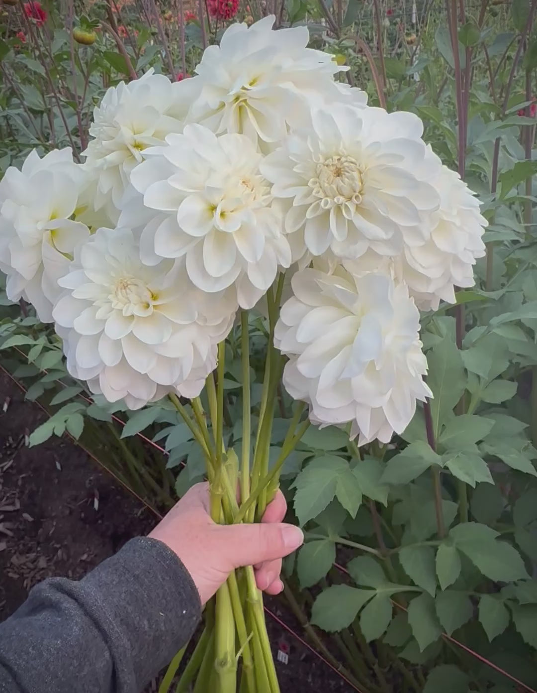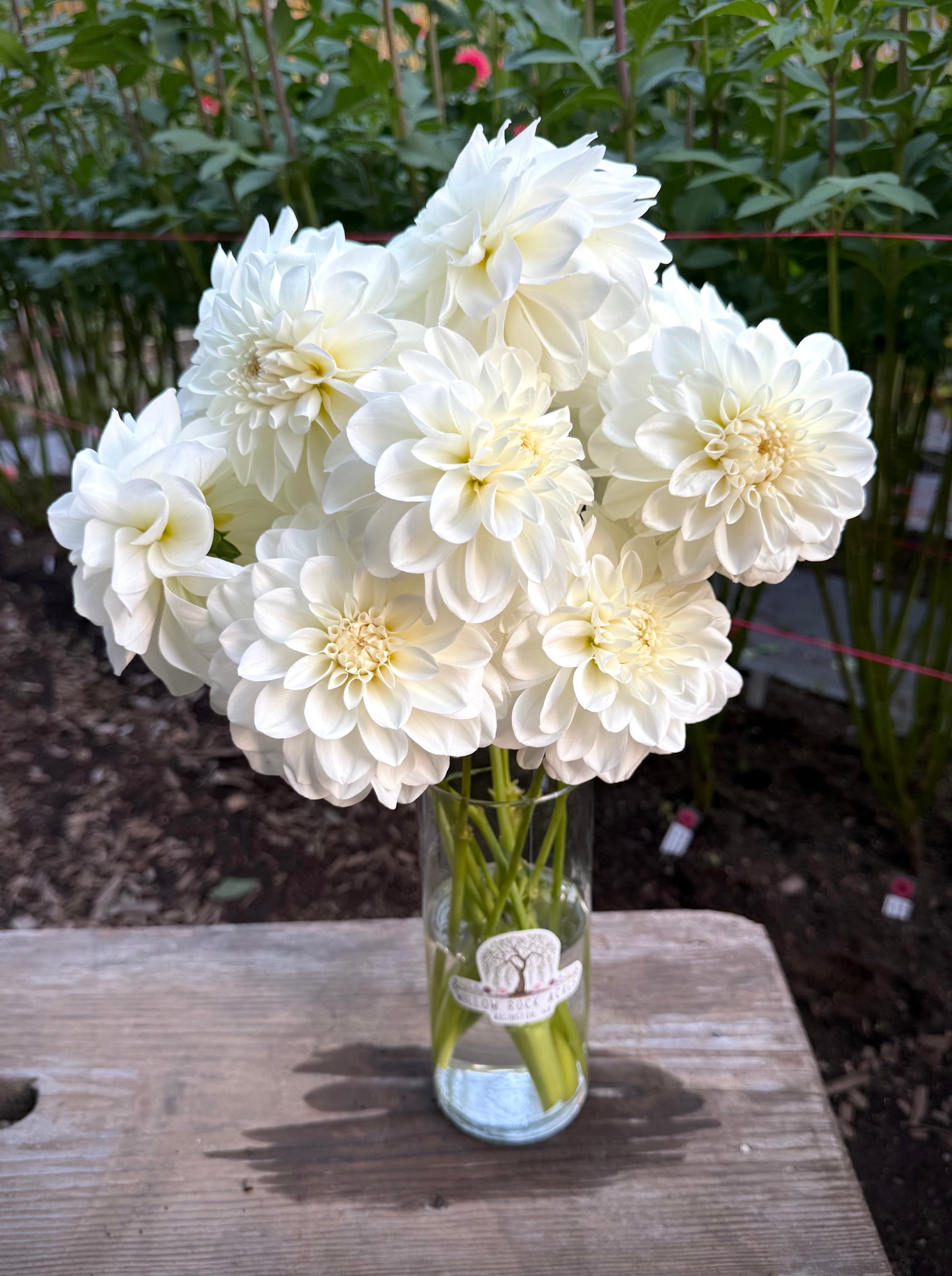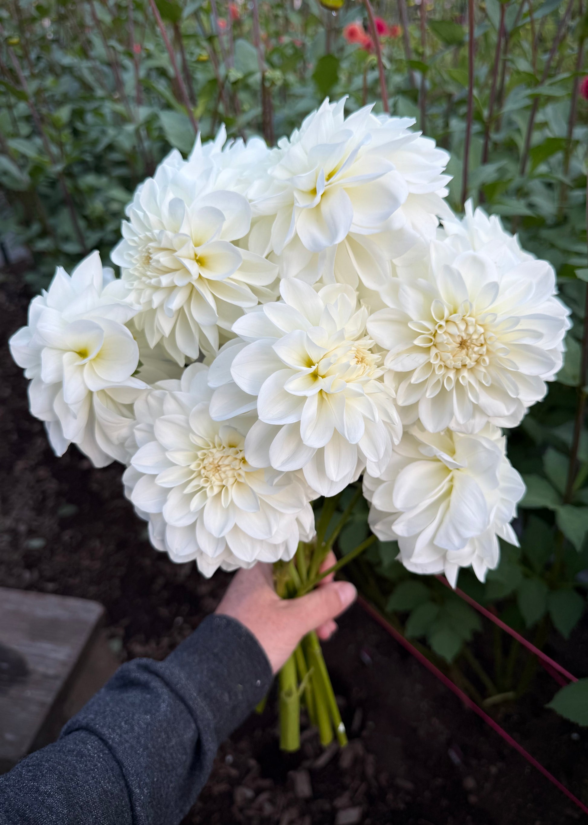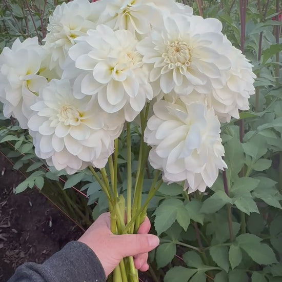 Mount Hood is solid white perfection. Beautifully rounded pure white 4 1/2 inch blooms with long, strong stems. Outstanding bloom angles and connection. Perfect for weddings or any cut flower bouquet. Tubers are produced in abundance and overwinter the best I’ve seen. Tubers very often produce little to no neck, but beautiful eyes. Always my go to for flower arrangements with consistent blooms. Every year I seem to plant more for myself. Plant height 4'.