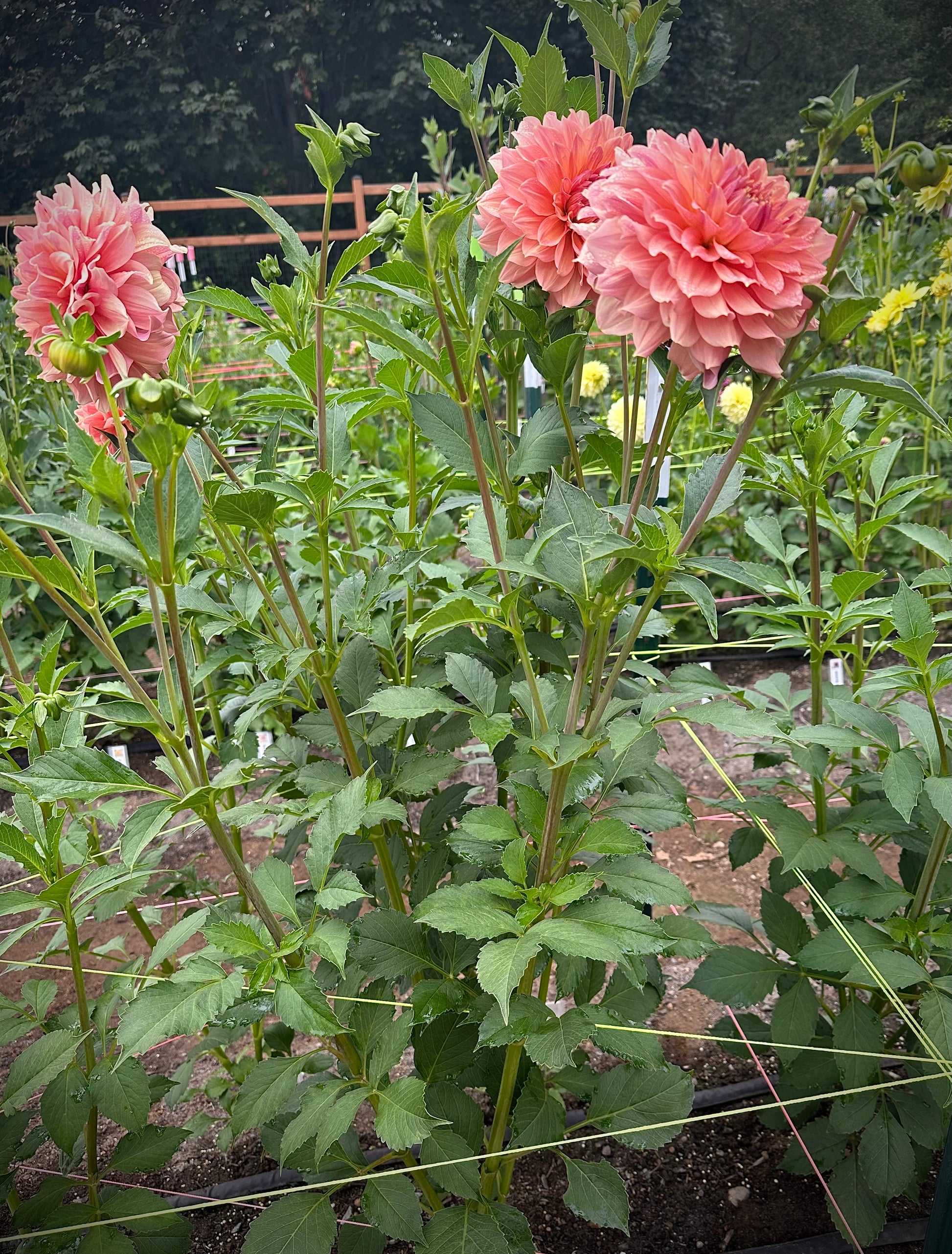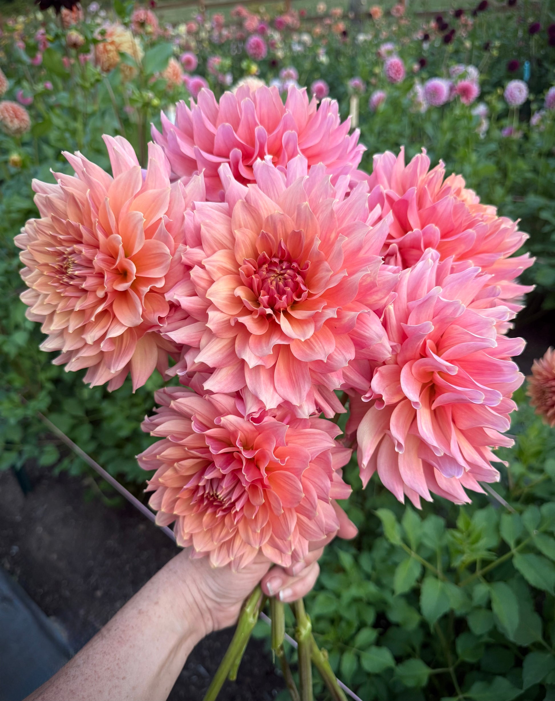 I can’t say enough good things about Peach Bud. First, the blooms are a perfect 5 inches. The color is the palest peach with hints of blush that work with any color palette. The color shifts a little darker during cooler temps. Even though the blooms are larger, the stems are sturdy and support them beautifully. Every time I see her in the garden I have to stop and stare. Amazing tuber production and overwinter capabilities. So easy to divide. Plant height 4’.