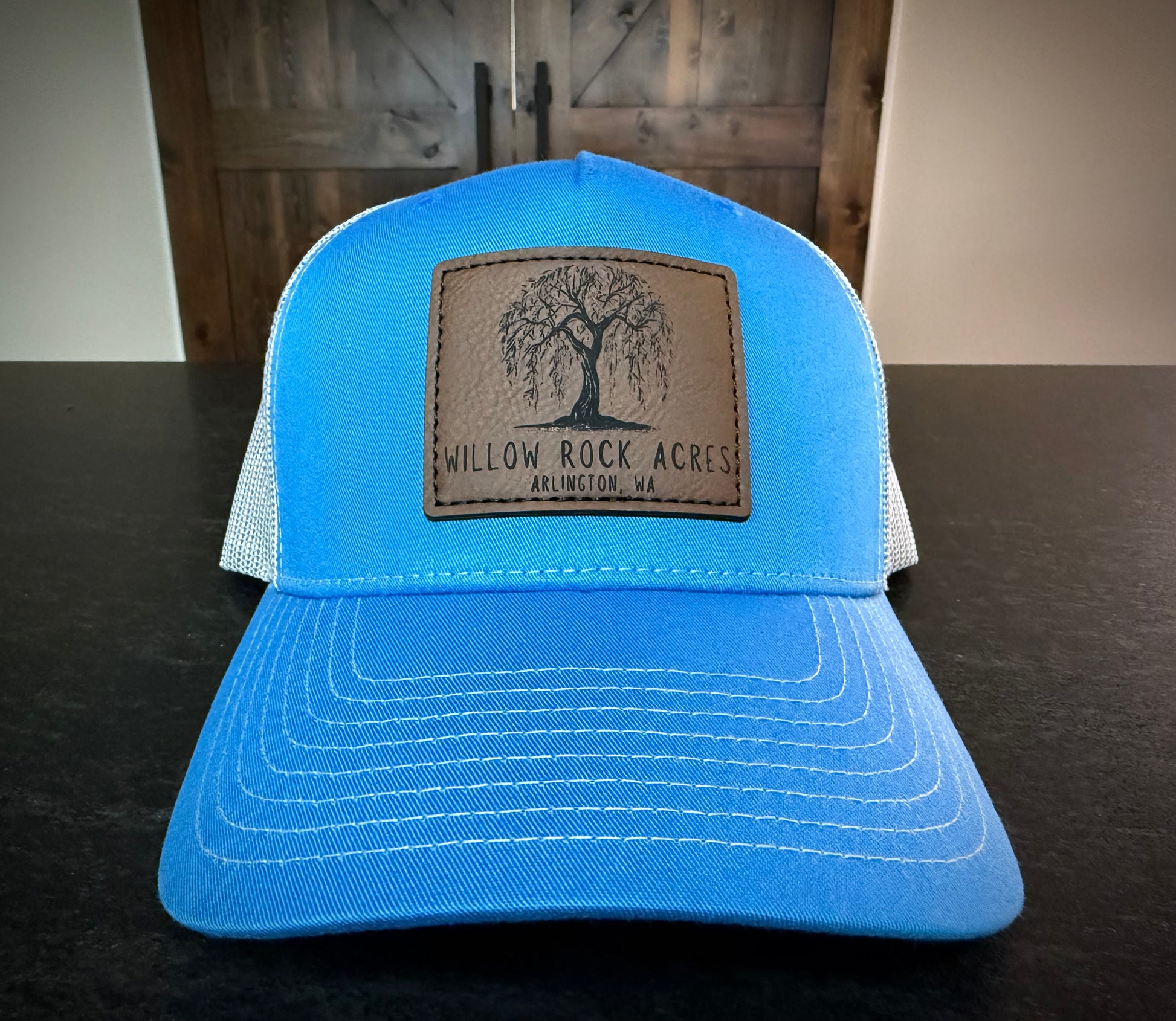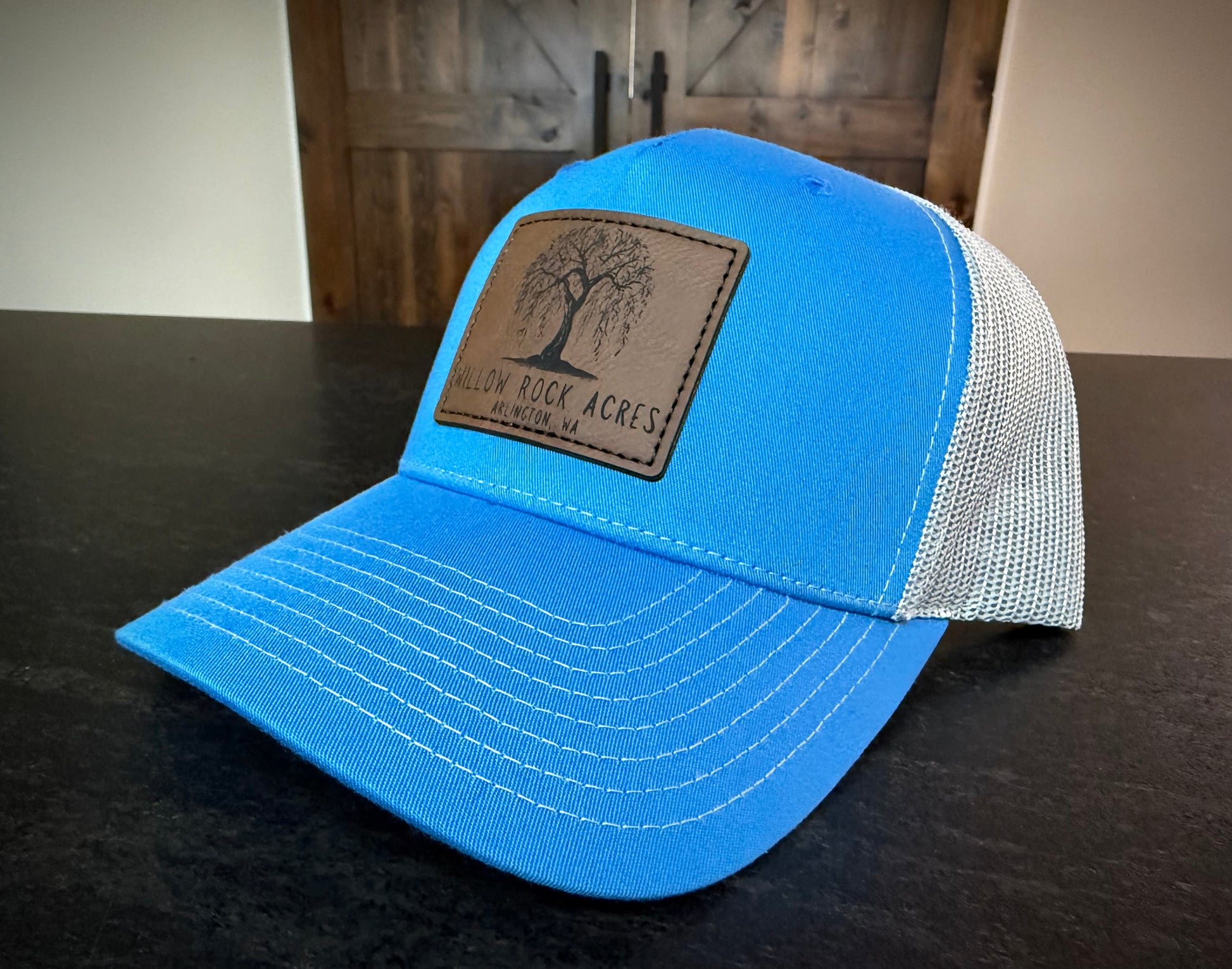Richardson 112 Adjustable trucker hat in Cobalt Blue/Grey. Leather patch with stitching surround.