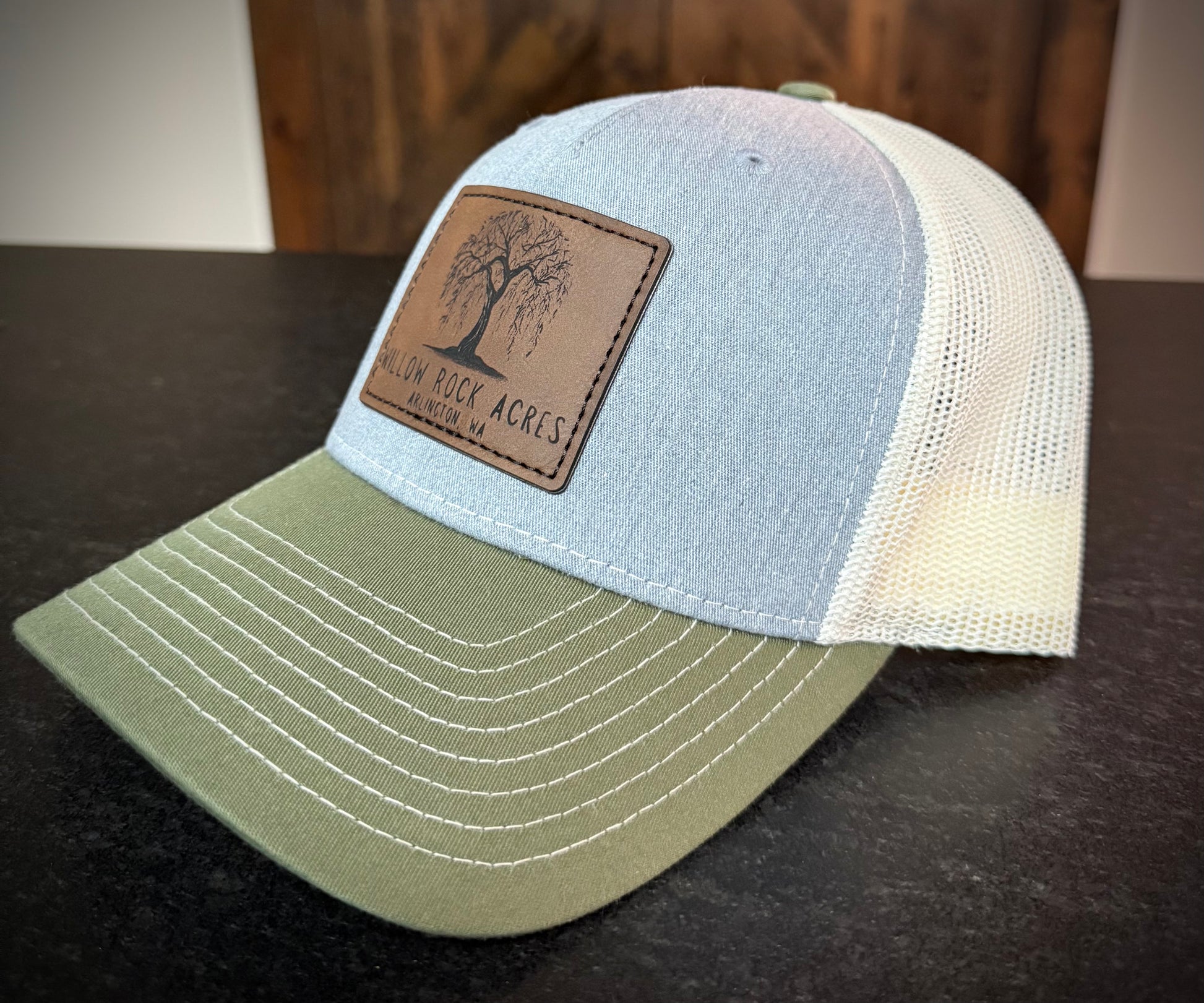 Richardson 112 Adjustable trucker hat in Heather Grey/Birch/Army Olive. Leather patch with stitching surround.