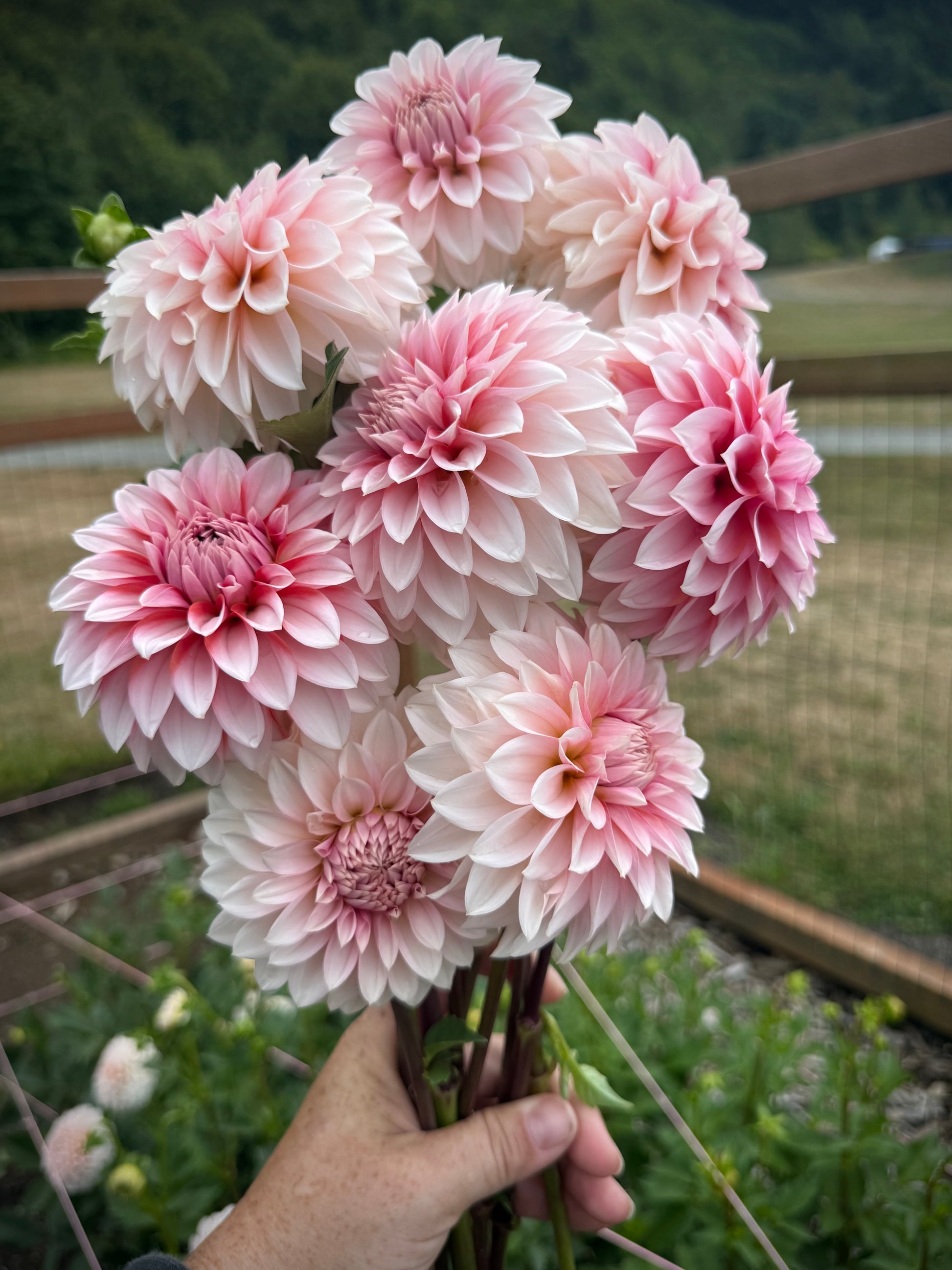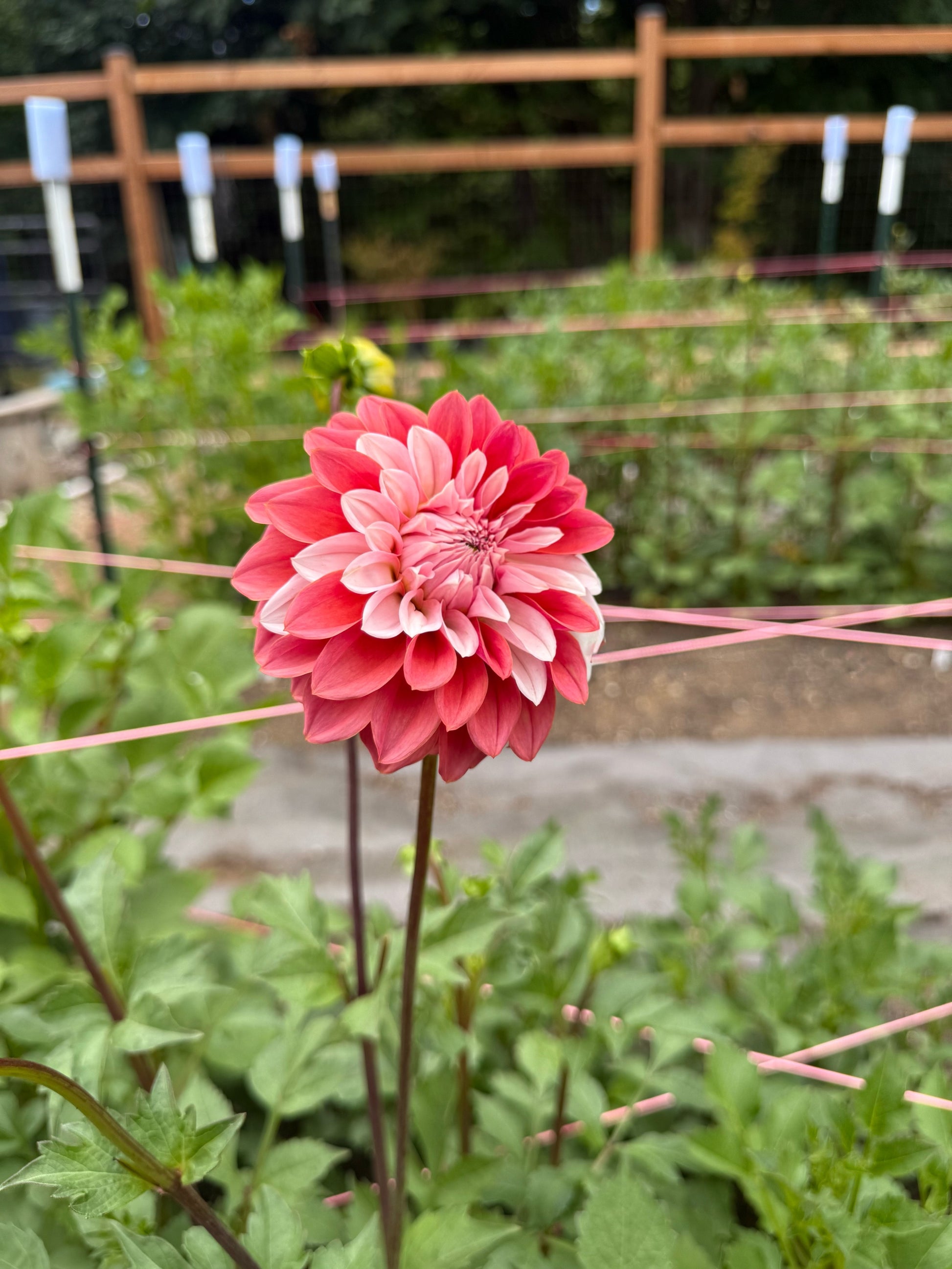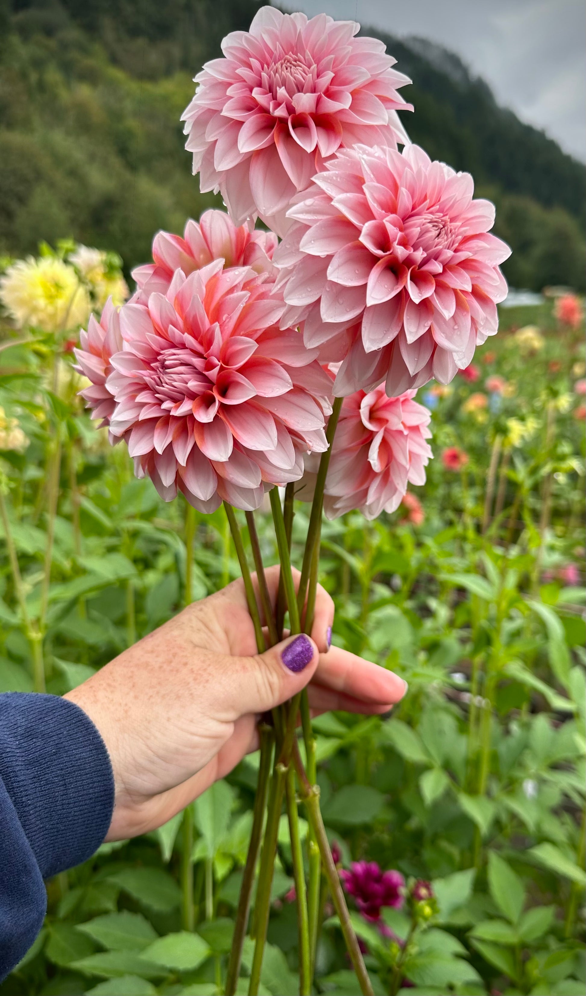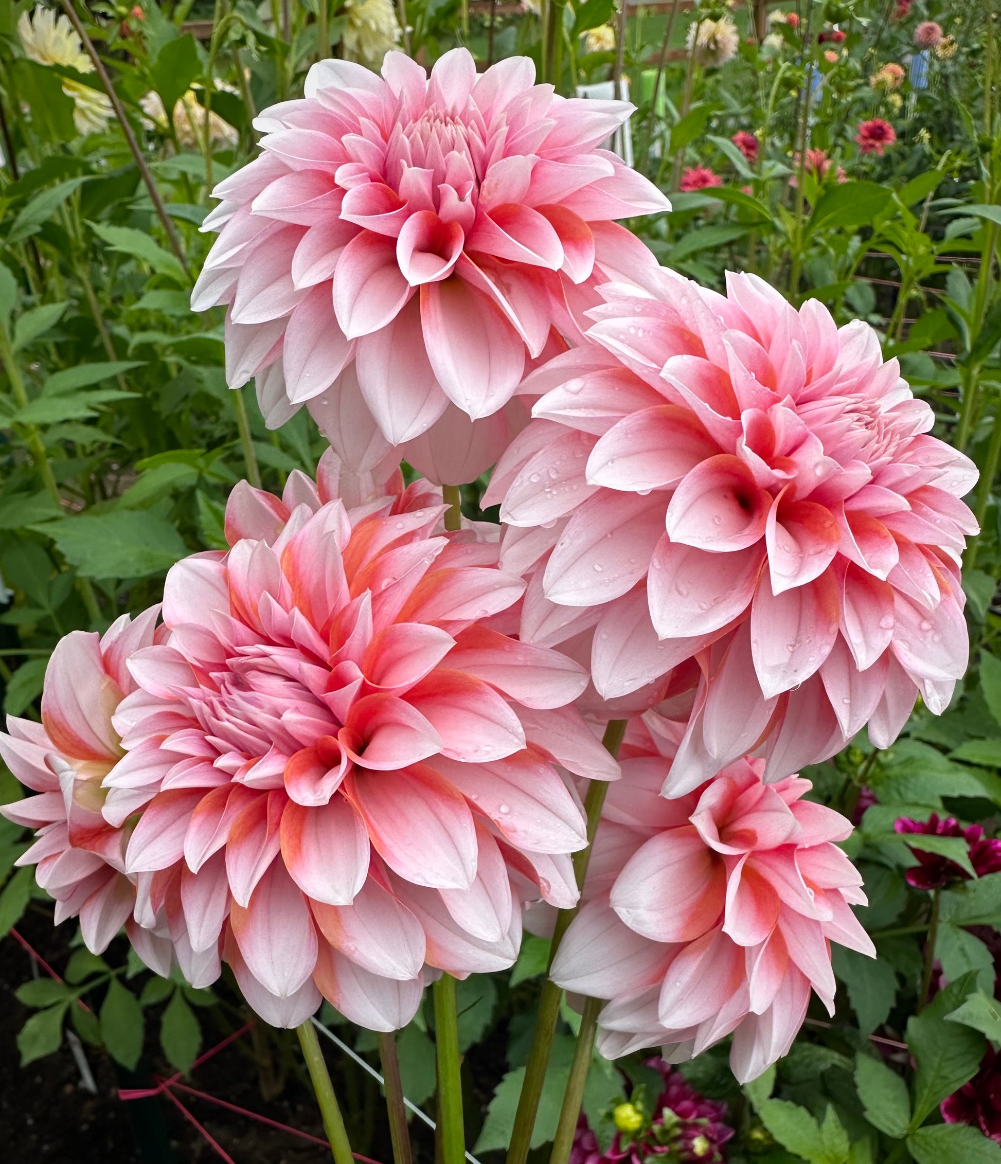 Show stopper! Stunning 3.5 inch blooms that boast coral centers that fade to creamy blush tips. Prolific bloomer with long, strong stems. Cuttings root fast and are great tuber producers that overwinter easily. Plant height 3.5’. Introduced by River Merle Farms in 2023.