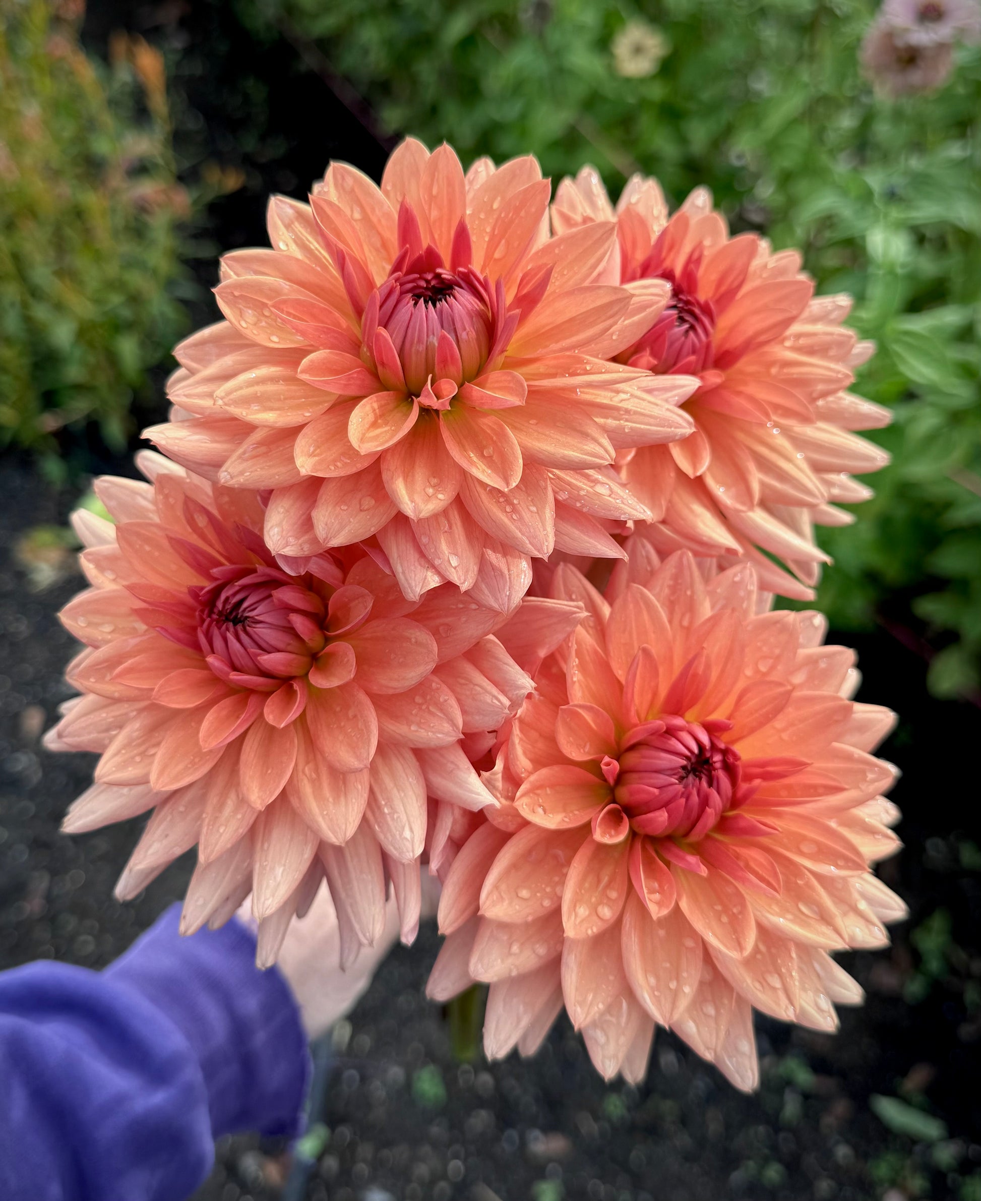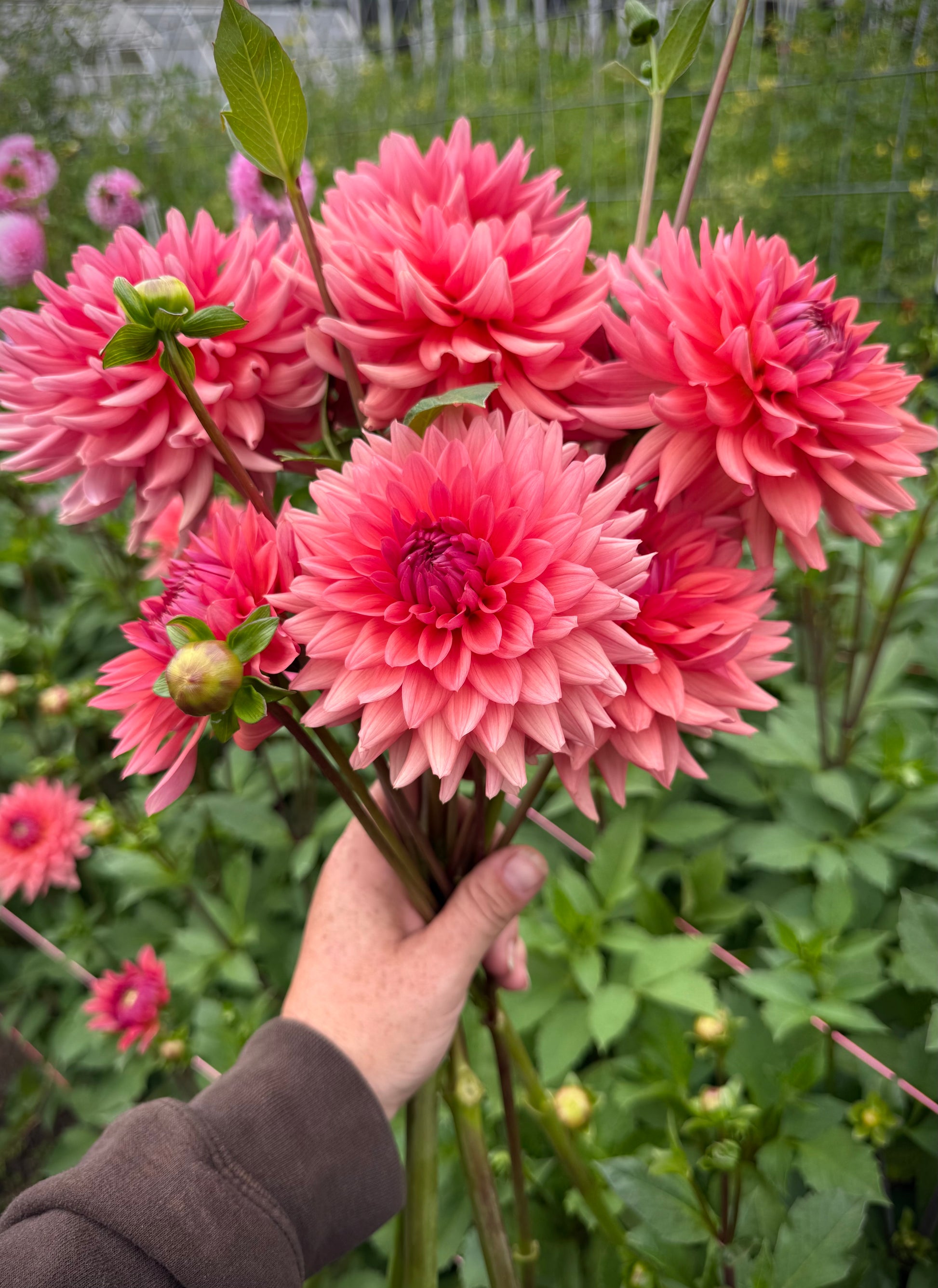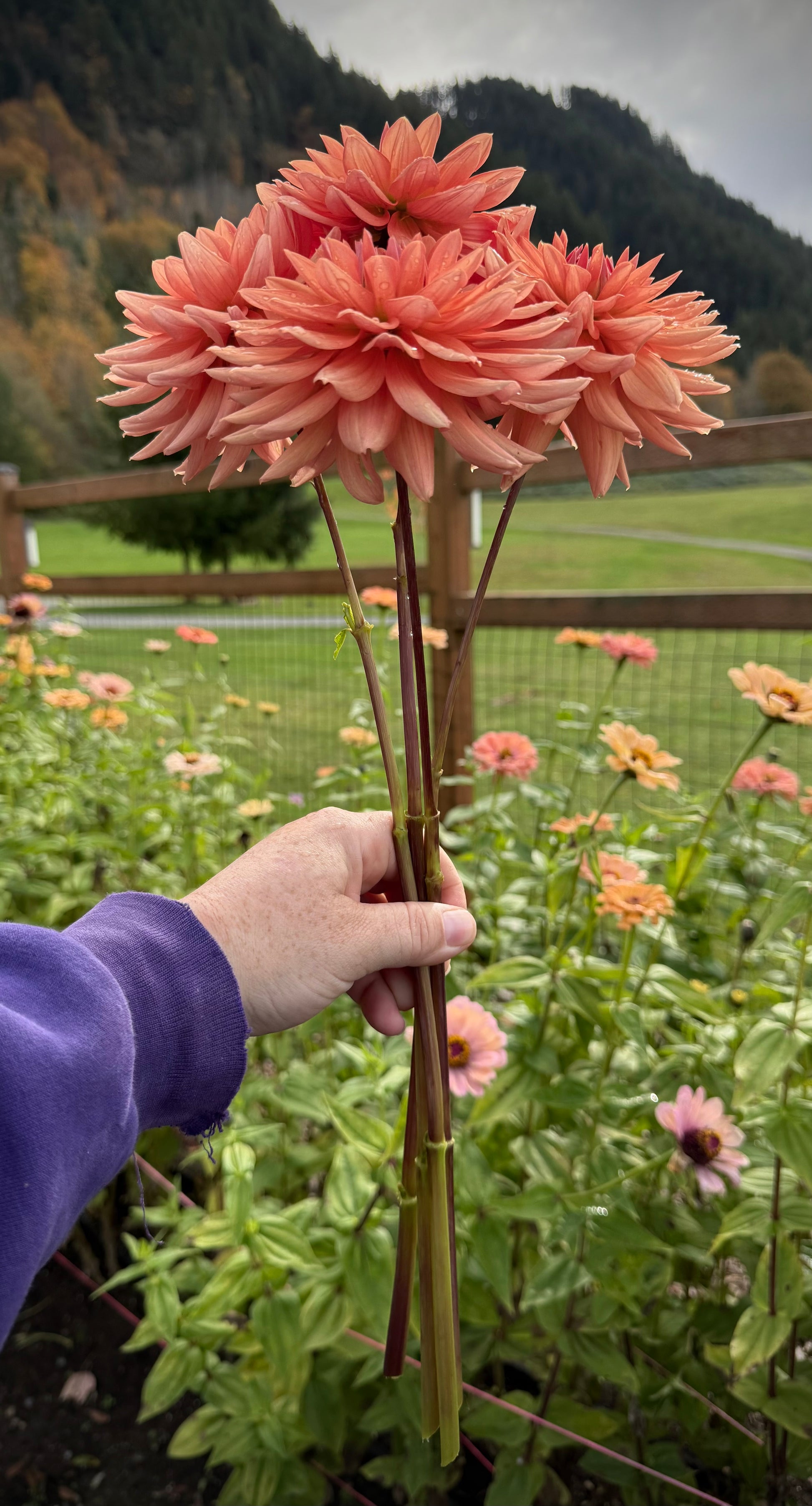 RM Electrical is a favorite in the garden. Coming in around 5 inches, this versatile bloom shifts slightly throughout the season from a muted rusty terracotta bloom to a vibrant, coral pink. Because of its short stature, it works great as a garden variety, but don’t let that fool you; it has the longest, strongest stems that make it an amazing cut flower as well. Great bloom connections and stem strength. Ample blooms at great angles all season long. Incredible tuber producer from cuttings and tubers alike. Plant height 4'. 2024 introduction from River Merle Farms.