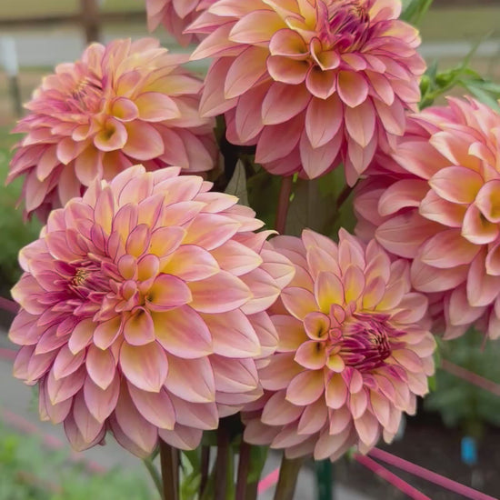 RM Raspberry Twinkle is a breathtaking new addition to the RM lineup, and she absolutely lives up to her name. This 3.5 inch dahlia glows in shades of soft raspberry, peach, and warm gold, with each petal brushed in watercolor like gradients that shift as the bloom matures. Petals have dark raspberry picotee leading to gold tips that are simply stunning.