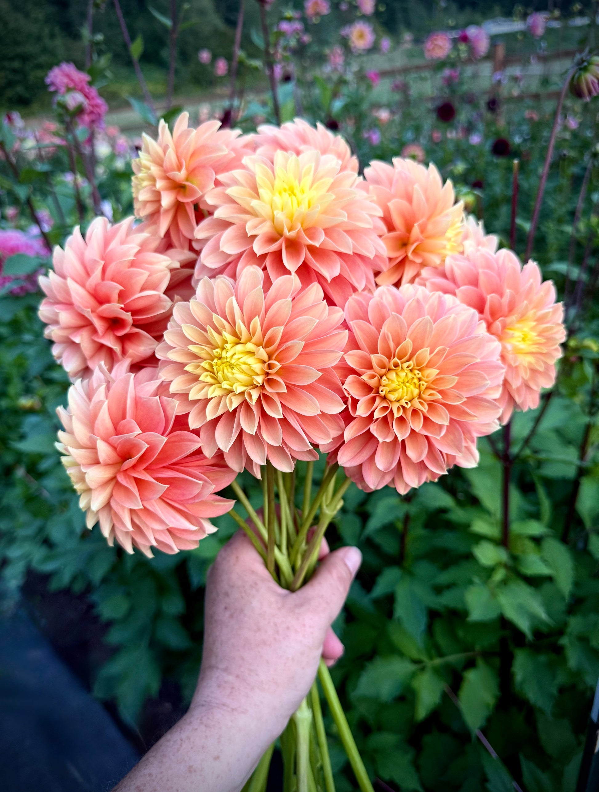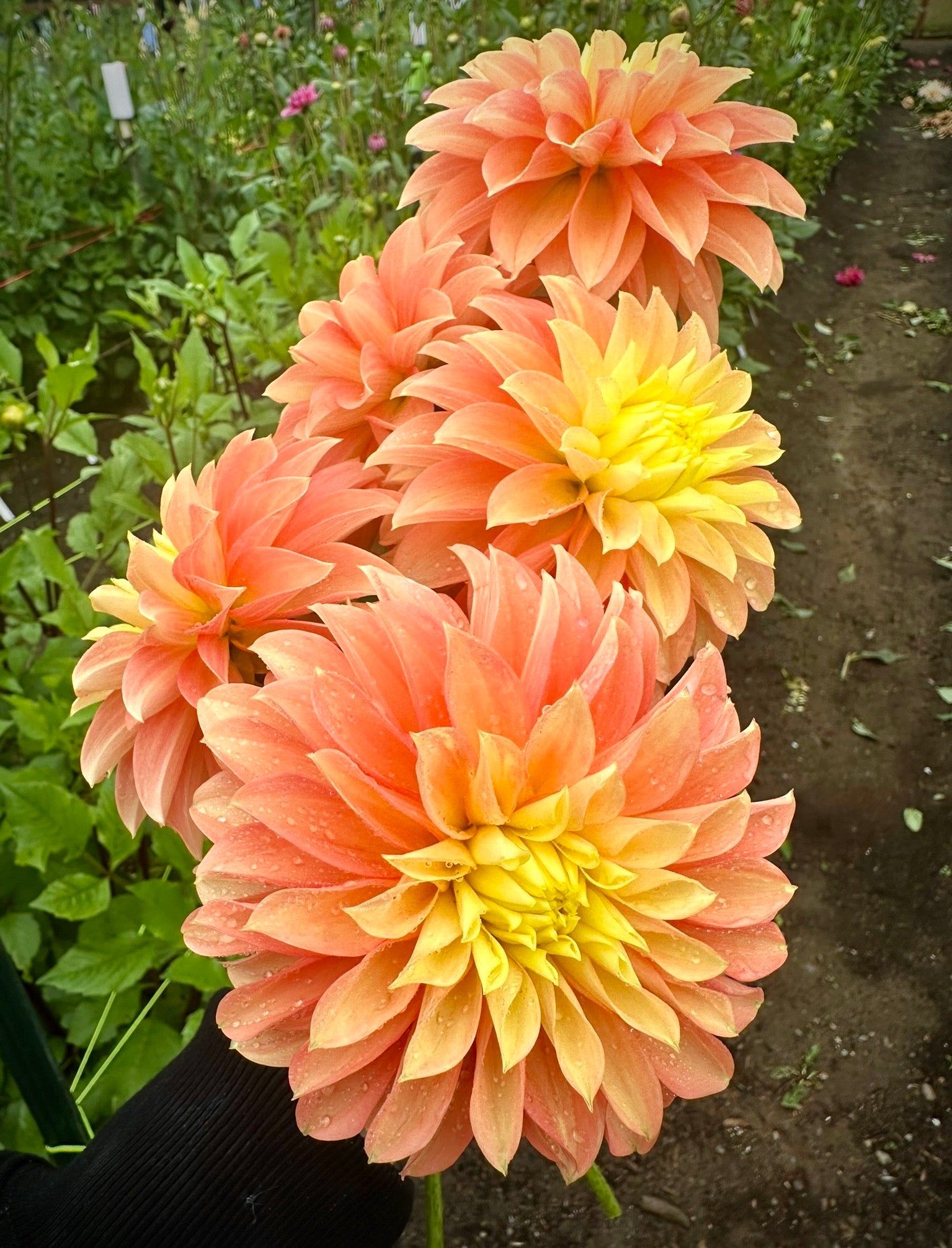 Beautiful 4 inch blooms with cheerful creamsicle colors reminiscent of rainbow sherbet. Stunning in arrangements and in landscaping! Long, strong stems. Ample tuber producer and has consistent blooms all season long. One of my favorites this season! Plant height 4'.