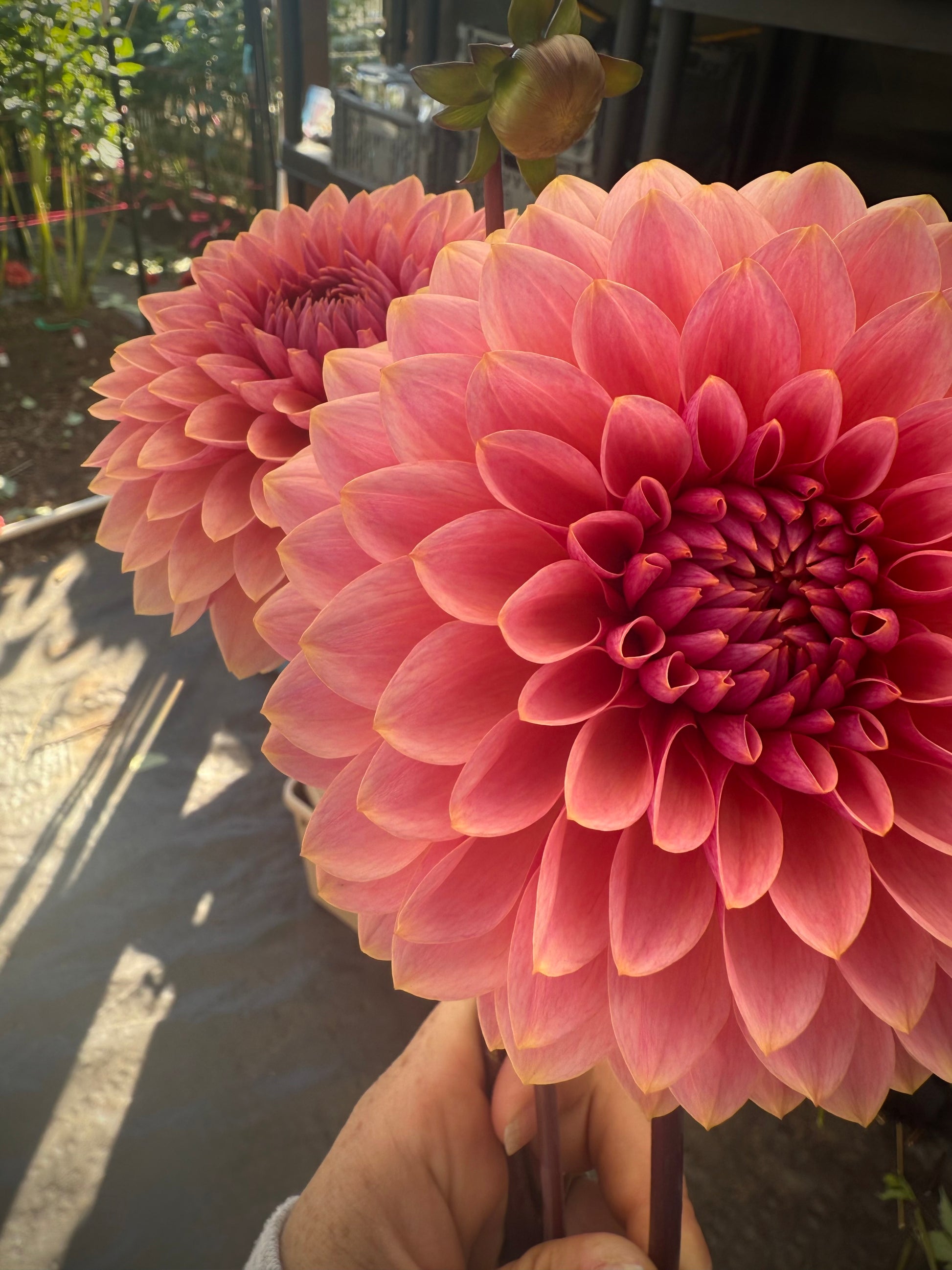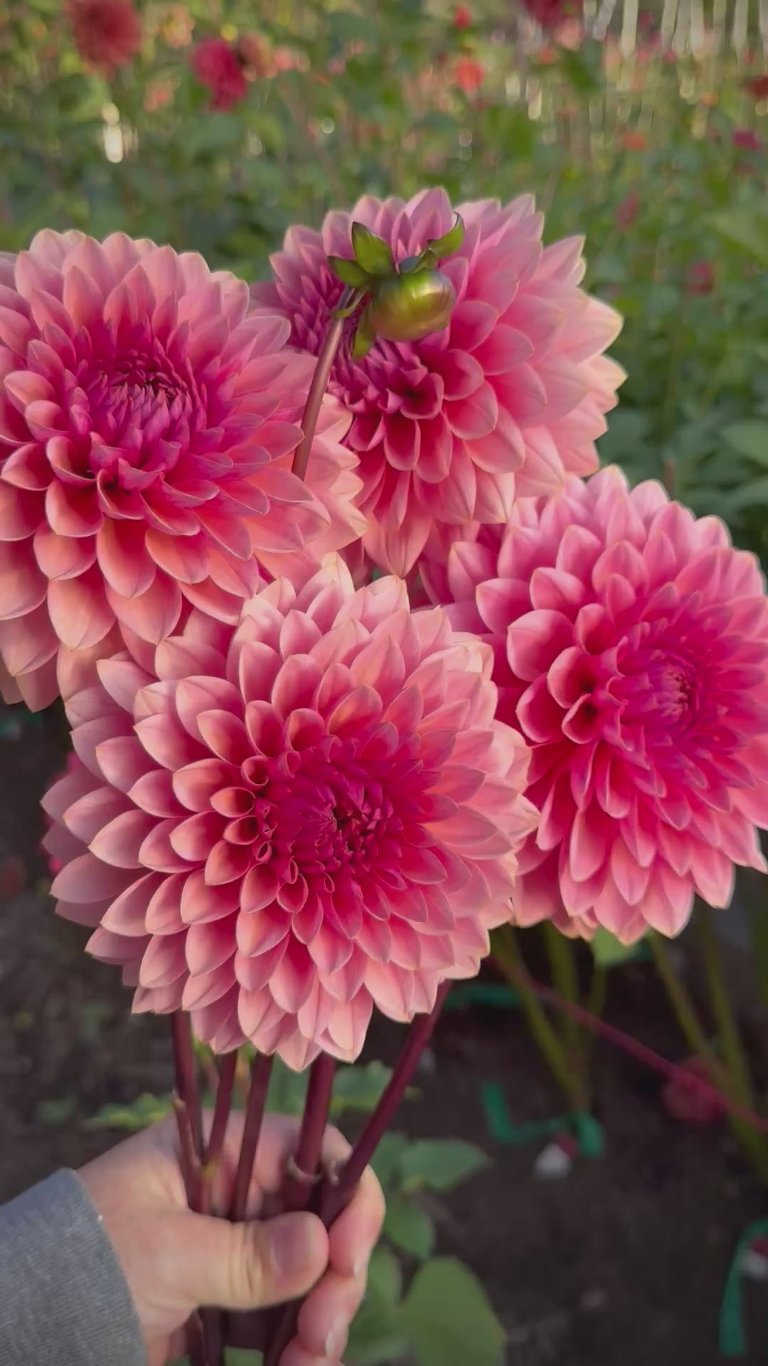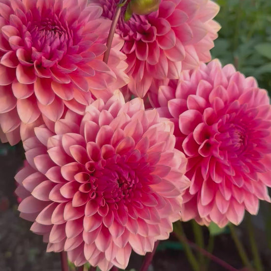 Perfectly symmetrical, raspberry muave blooms with high petal count that have long, strong stems and great vase life. Stunning, dark foliage. Perfect form and size coming in around 4.5 inches. Great tuber producer from both tubers and cuttings alike. Plant height 4'.